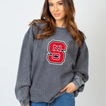 Our best seller! The oversized North Carolina State Wolfpack Corded Crew sweatshirt features a super soft, vintage wash corded fabric. Ribbed crew neckline, cuffs, and hemline. Each piece is individually dyed, so please note there may be variation in color piece to piece. Sometimes, there can be a light streak at the shoulder due to the unique dye process, which is common.