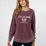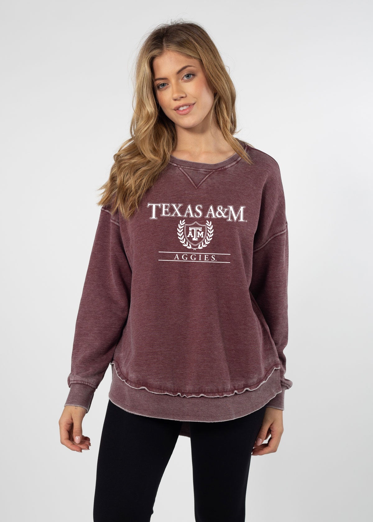 This ultra-soft Texas A&M Aggies crew neck with dropped shoulders and relaxed hi-lo curved bottom hemline features ribbed neckline, cuffs and hem. Our favorite worn look is achieved by the burnout wash process.