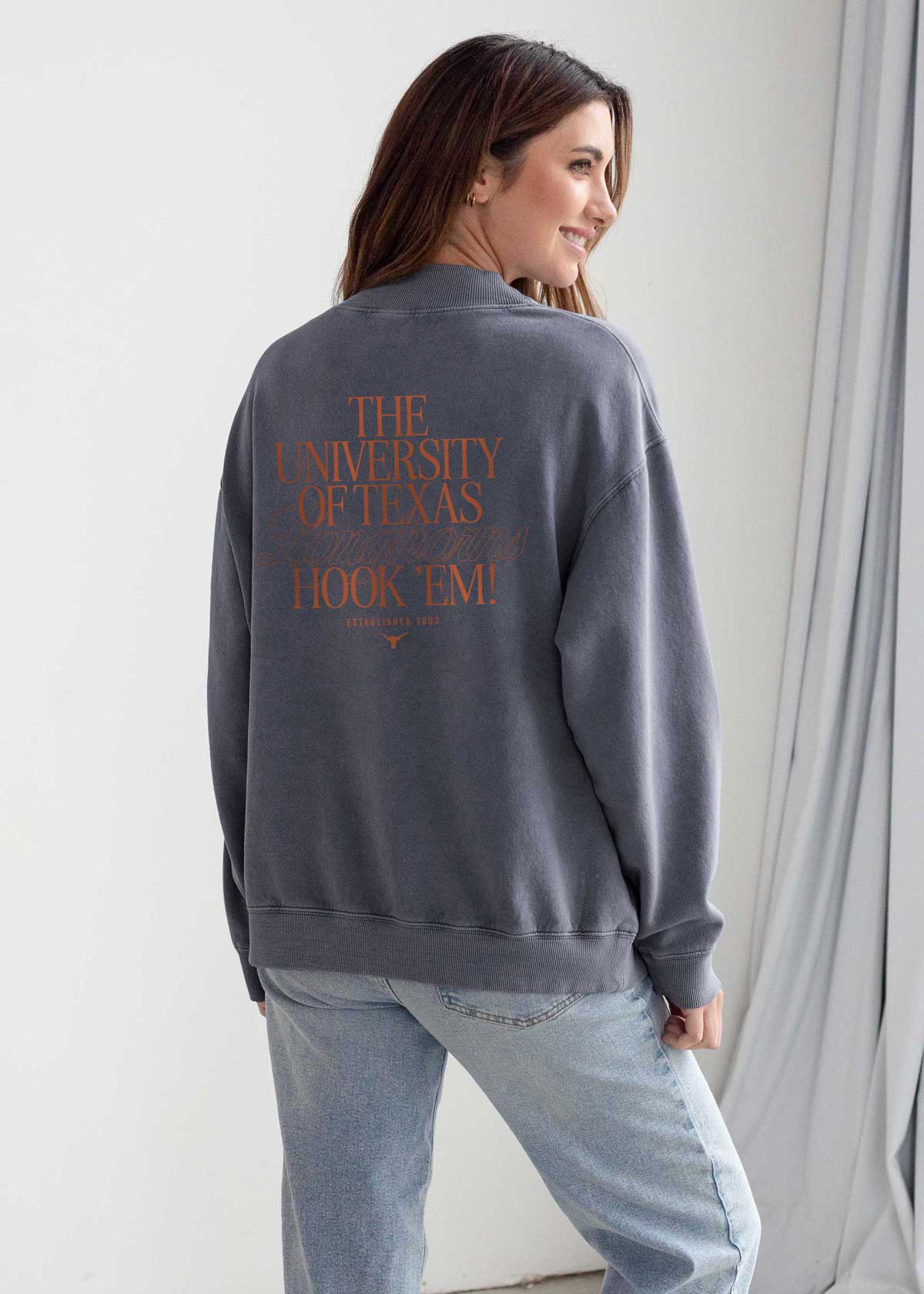 Elevate your style game with our officially licensed Texas Longhorns Nantucket Mock-Neck. Meticulously crafted from our signature Salt Wash fleece, this pullover is as soft as it gets, offering a luxurious feel against your skin. Boasting a sleek mock neck design, it seamlessly blends retro vibes with sophistication and comfort, making it a timeless addition to your wardrobe.