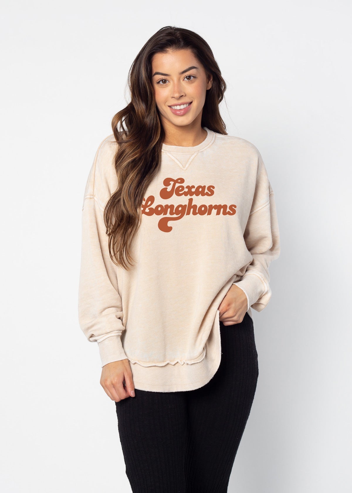 This ultra-soft Texas Longhorns crew neck with dropped shoulders and relaxed hi-lo curved bottom hemline features ribbed neckline, cuffs and hem. Our favorite worn look is achieved by the burnout wash process.