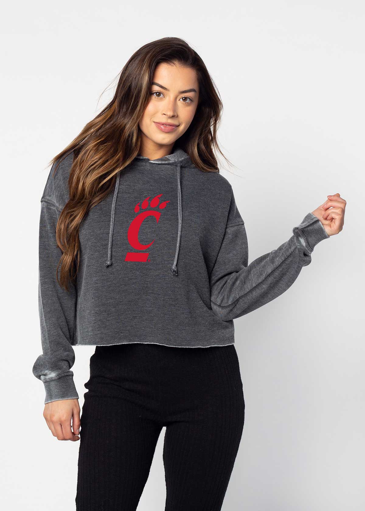 Meet the Cincinnati Big Logo Mid-Length Hoodie. The softest hoodie you'll own! Roomy and boxy burnout fleece cropped hoodie. Features a drawstring hood, dropped shoulders, and raw edge hemline. Burnout wash process provides a unique, washed and worn look and a comfortable feel. Pairs perfectly with our burnout joggers for trendy matching set.