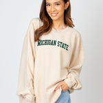 Our best seller! The oversized Michigan State Spartans Corded Crew sweatshirt features a super soft, vintage wash corded fabric. Ribbed crew neckline, cuffs, and hemline. Each piece is individually dyed, so please note there may be variation in color piece to piece. Sometimes, there can be a light streak at the shoulder due to the unique dye process, which is common.