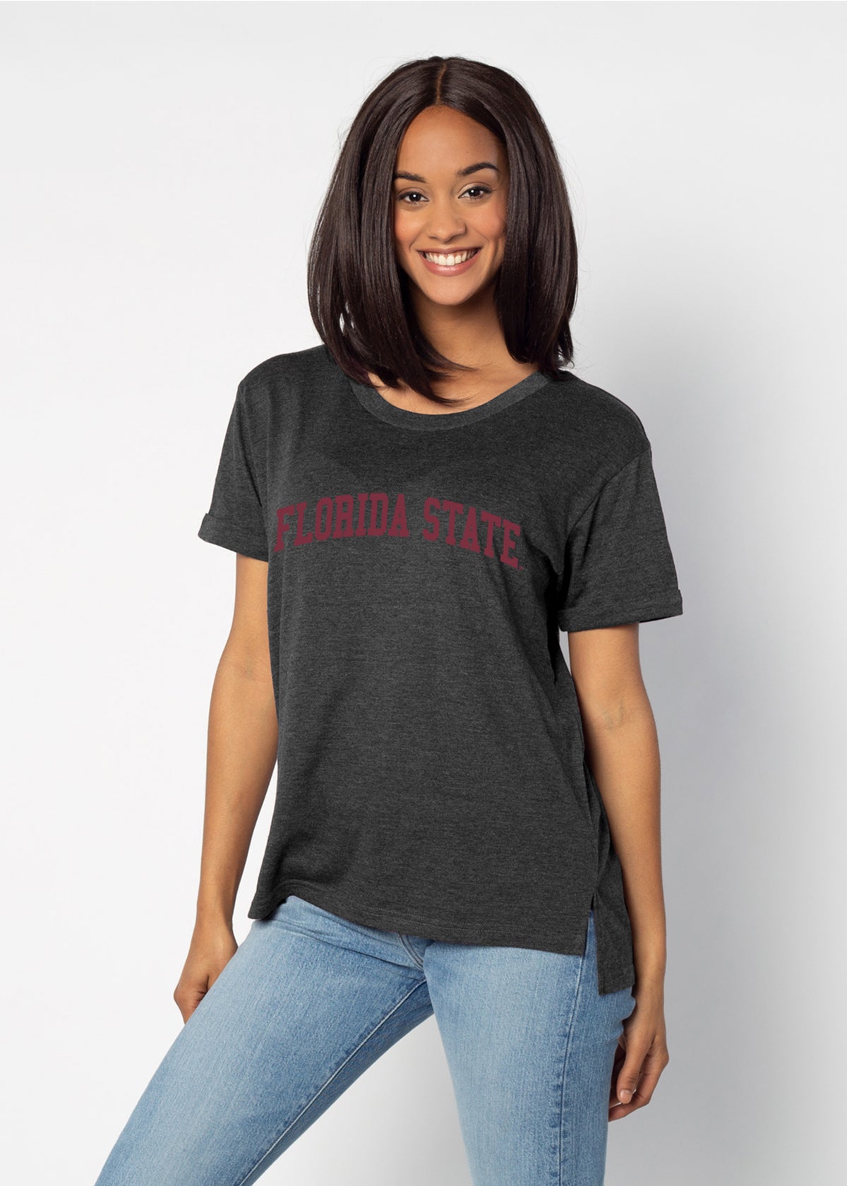 A Florida State Seminoles staple with just the right amount of detail. This easygoing everyday tee is crafted from a lightweight cotton poly blend with a subtle heathered look and a soft hand feel. Features ribbed scoop neck, short rolled sleeves, and a longer back hem for extra coverage.