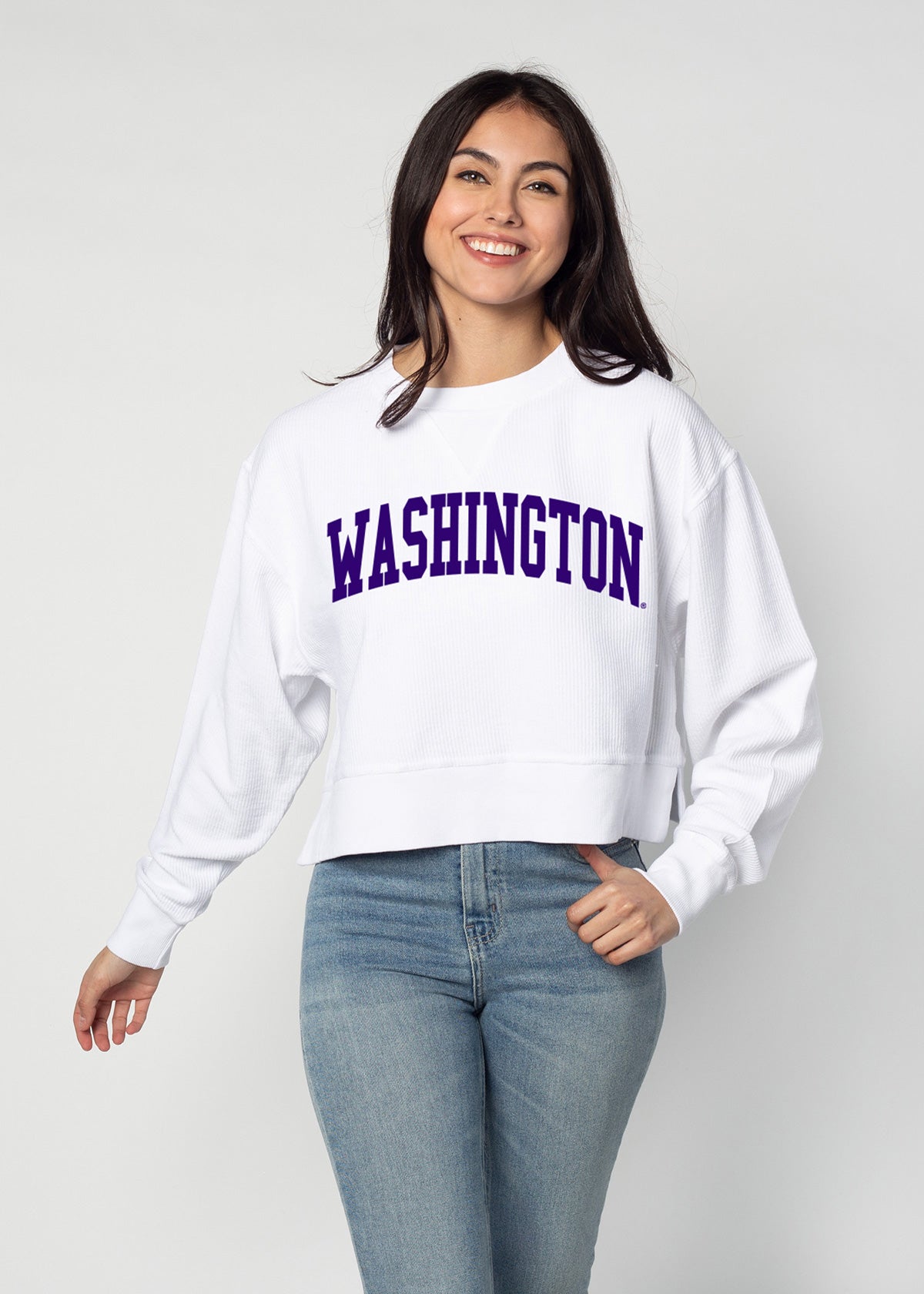 An update to our best seller! Washington Huskies oversized sweatshirt with a super soft vintage wash corded fabric. Waist-length, feminine silhouette features a ribbed neckline, cuff and hemline.