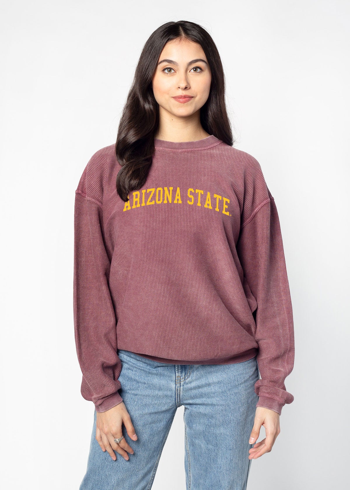 Our best seller! The oversized Arizona State Sun Devils Corded Crew sweatshirt features a super soft, vintage wash corded fabric. Ribbed crew neckline, cuffs, and hemline. Each piece is individually dyed, so please note there may be variation in color piece to piece. Sometimes, there can be a light streak at the shoulder due to the unique dye process, which is common.