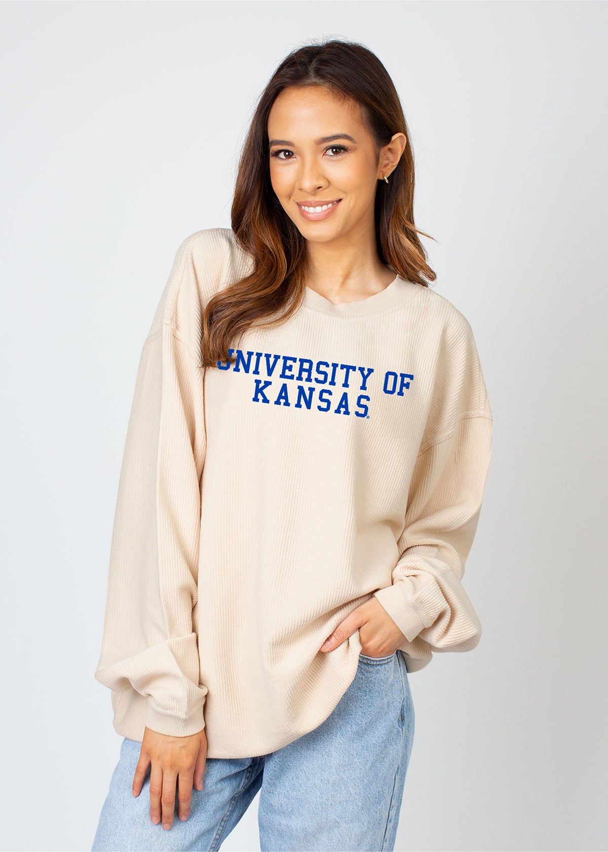 Our best seller! The oversized Kansas Jayhawks Corded Crew sweatshirt features a super soft, vintage wash corded fabric. Ribbed crew neckline, cuffs, and hemline. Each piece is individually dyed, so please note there may be variation in color piece to piece. Sometimes, there can be a light streak at the shoulder due to the unique dye process, which is common.