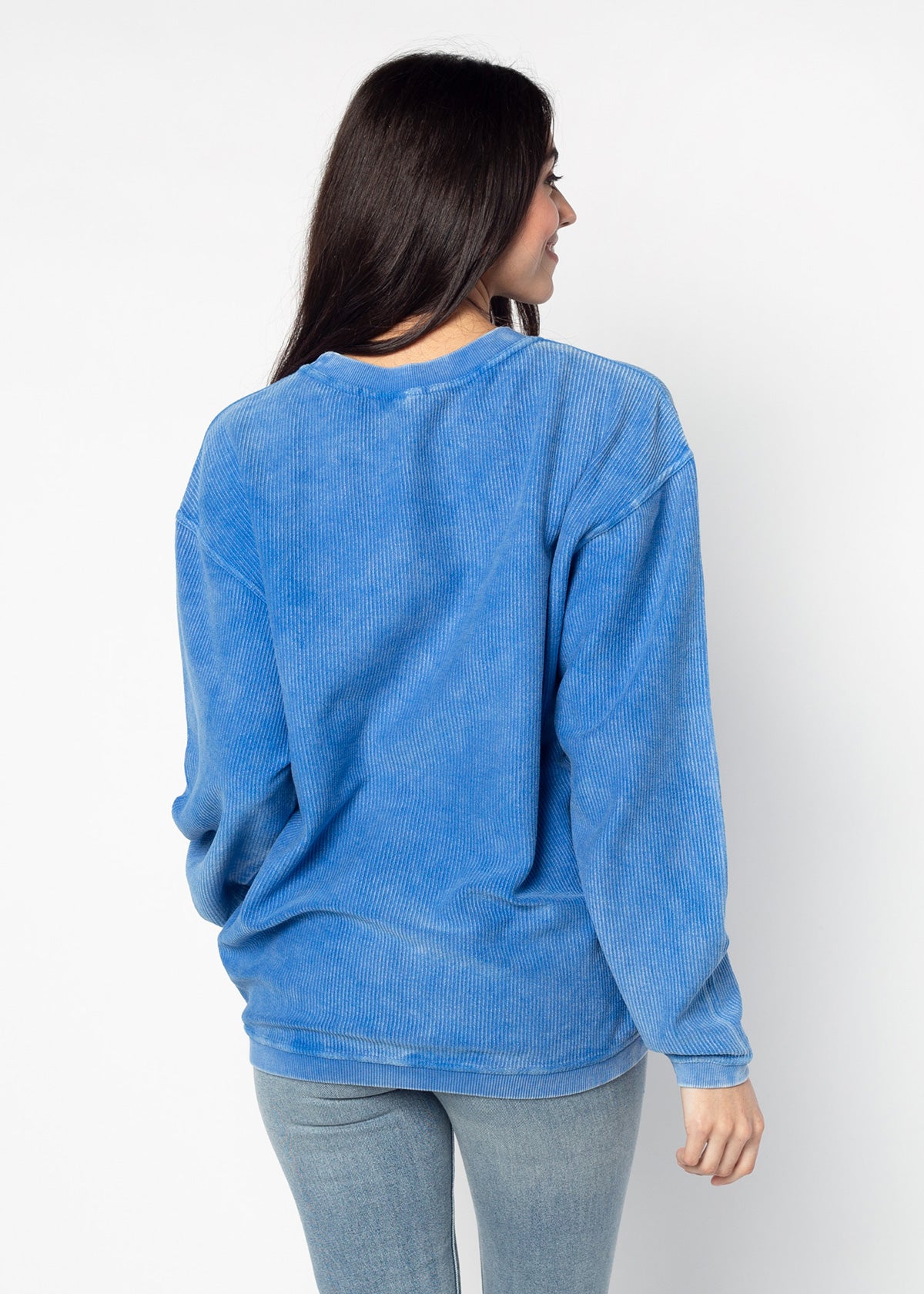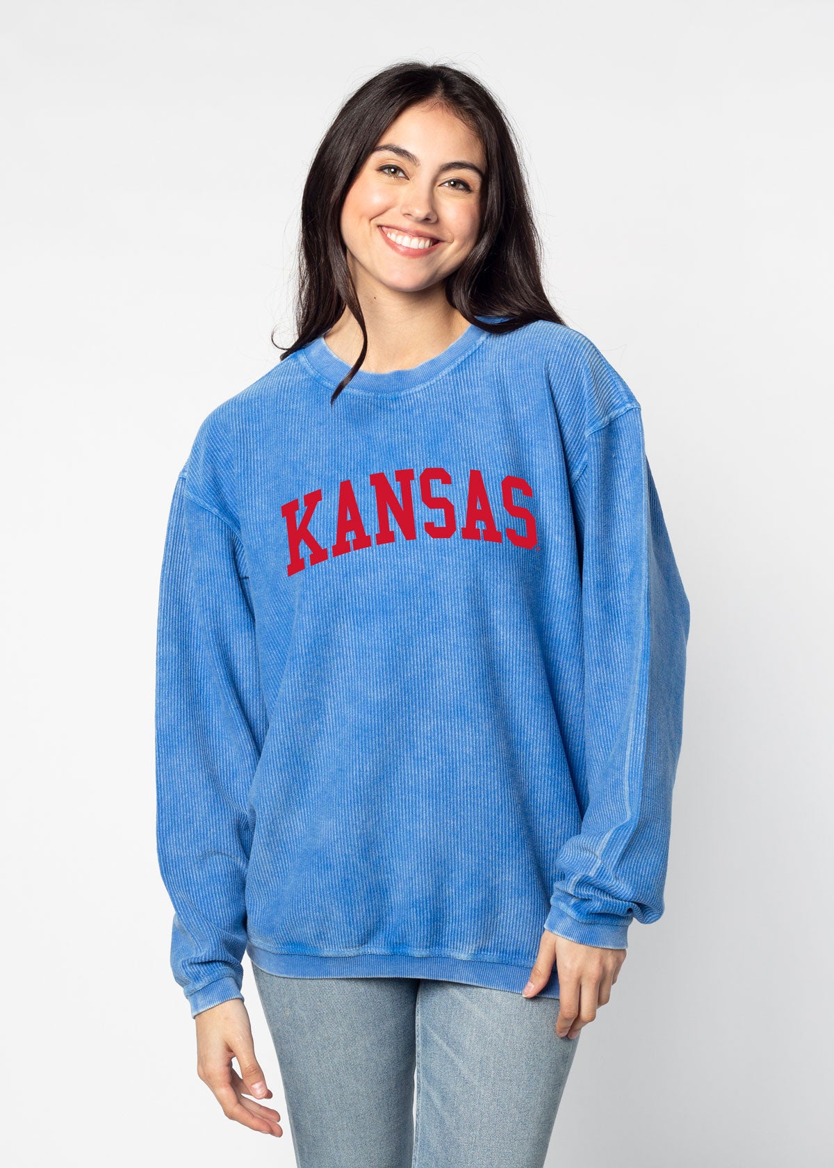 Our best seller! The oversized Kansas Jayhawks Corded Crew sweatshirt features a super soft, vintage wash corded fabric. Ribbed crew neckline, cuffs, and hemline. Each piece is individually dyed, so please note there may be variation in color piece to piece. Sometimes, there can be a light streak at the shoulder due to the unique dye process, which is common.