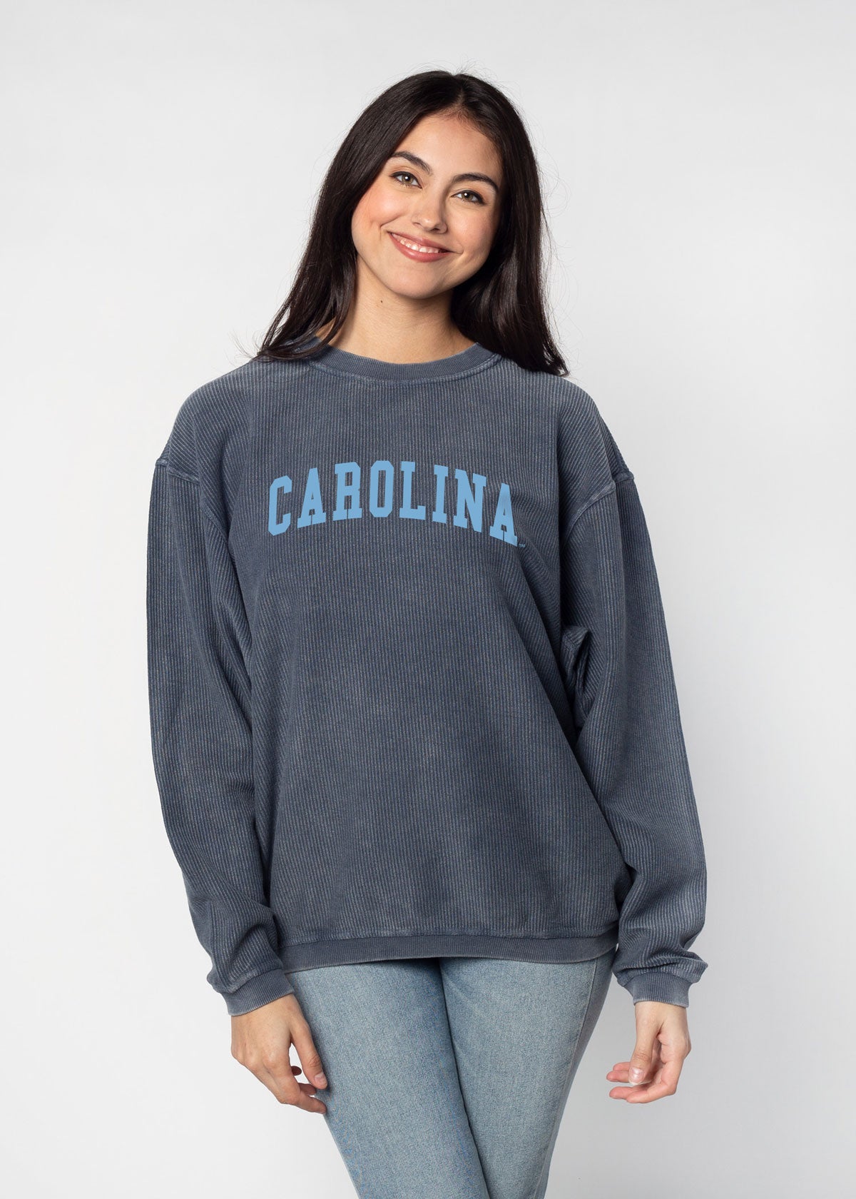 Our best seller! The oversized North Carolina Tar Heels Corded Crew sweatshirt features a super soft, vintage wash corded fabric. Ribbed crew neckline, cuffs, and hemline. Each piece is individually dyed, so please note there may be variation in color piece to piece. Sometimes, there can be a light streak at the shoulder due to the unique dye process, which is common.