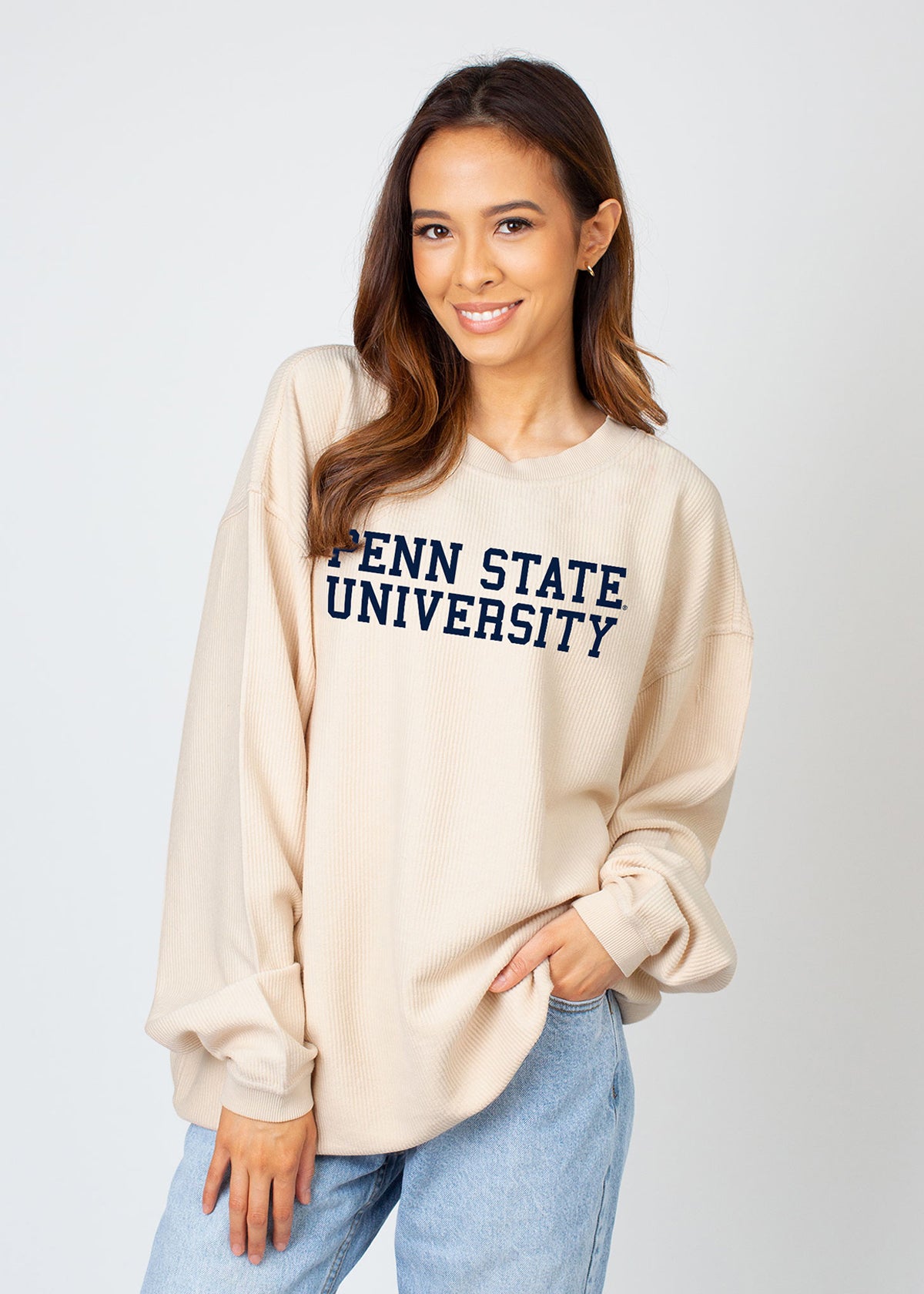 Our best seller! The oversized Penn State Nittany Lions Corded Crew sweatshirt features a super soft, vintage wash corded fabric. Ribbed crew neckline, cuffs, and hemline. Each piece is individually dyed, so please note there may be variation in color piece to piece. Sometimes, there can be a light streak at the shoulder due to the unique dye process, which is common.