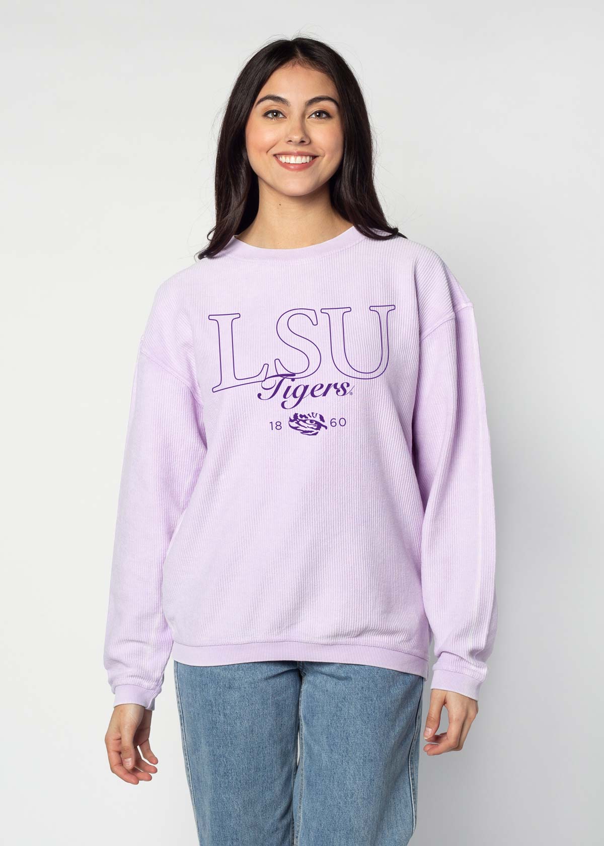 Our best seller! Officially licensed LSU Tigers oversized sweatshirt made with super soft, vintage-washed corded fabric. Features a ribbed crew neckline, cuffs, and hemline. Each piece is individually dyed, so please note there may be variation in color piece to piece. Sometimes, there can be a light streak at the shoulder due to the unique dye process, which is common.