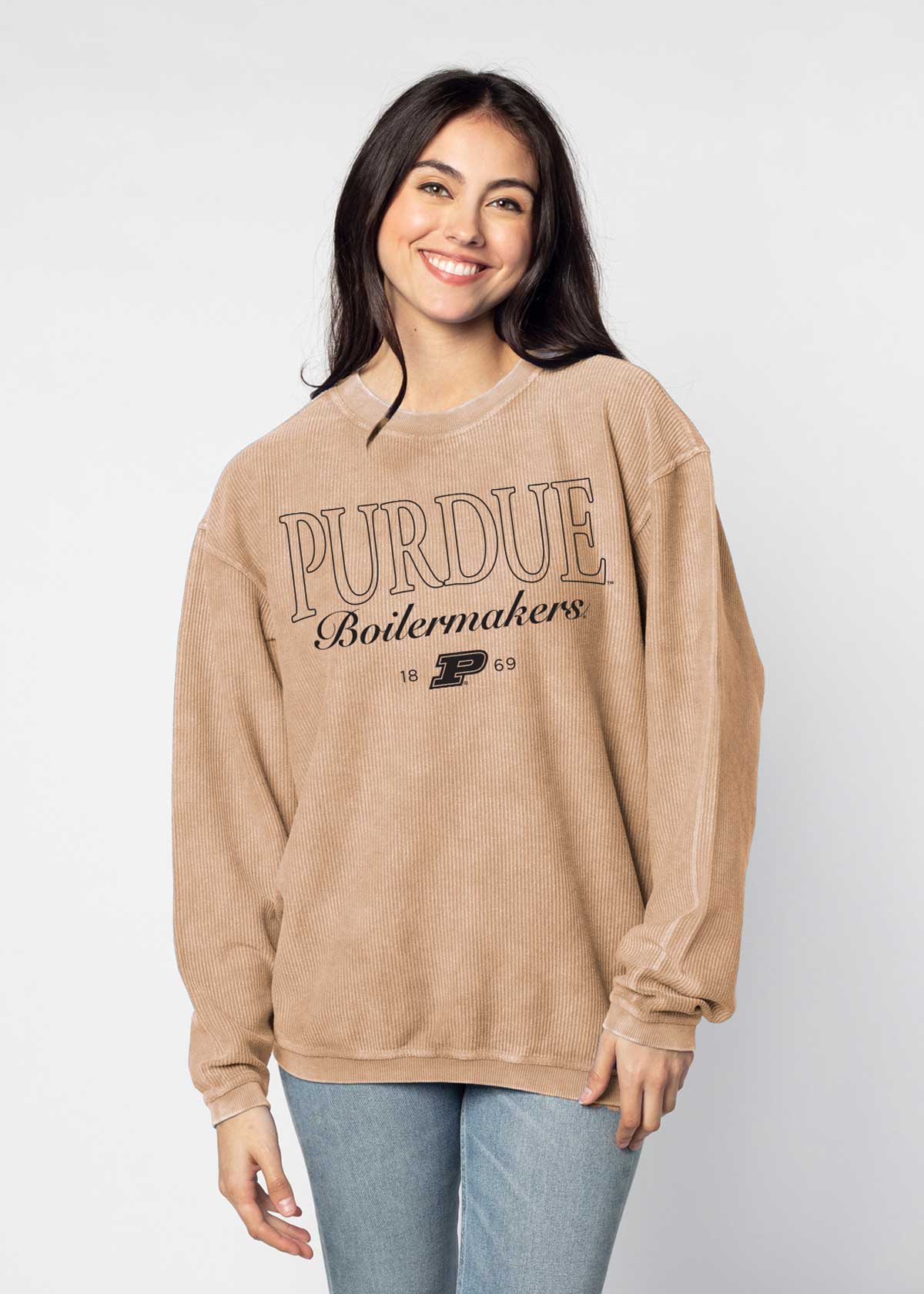 Our best seller! Officially licensed Purdue Boilermakers oversized sweatshirt made with super soft, vintage-washed corded fabric. Features a ribbed crew neckline, cuffs, and hemline. Each piece is individually dyed, so please note there may be variation in color piece to piece. Sometimes, there can be a light streak at the shoulder due to the unique dye process, which is common.