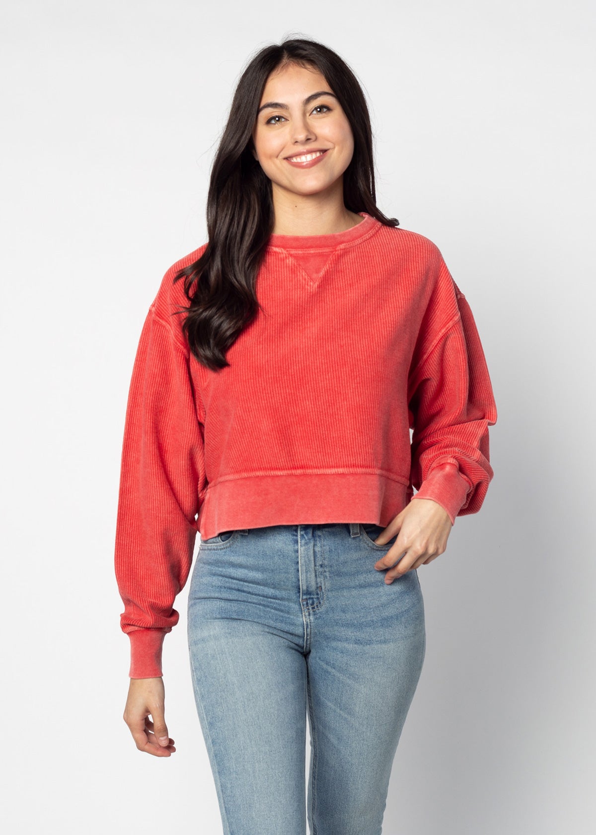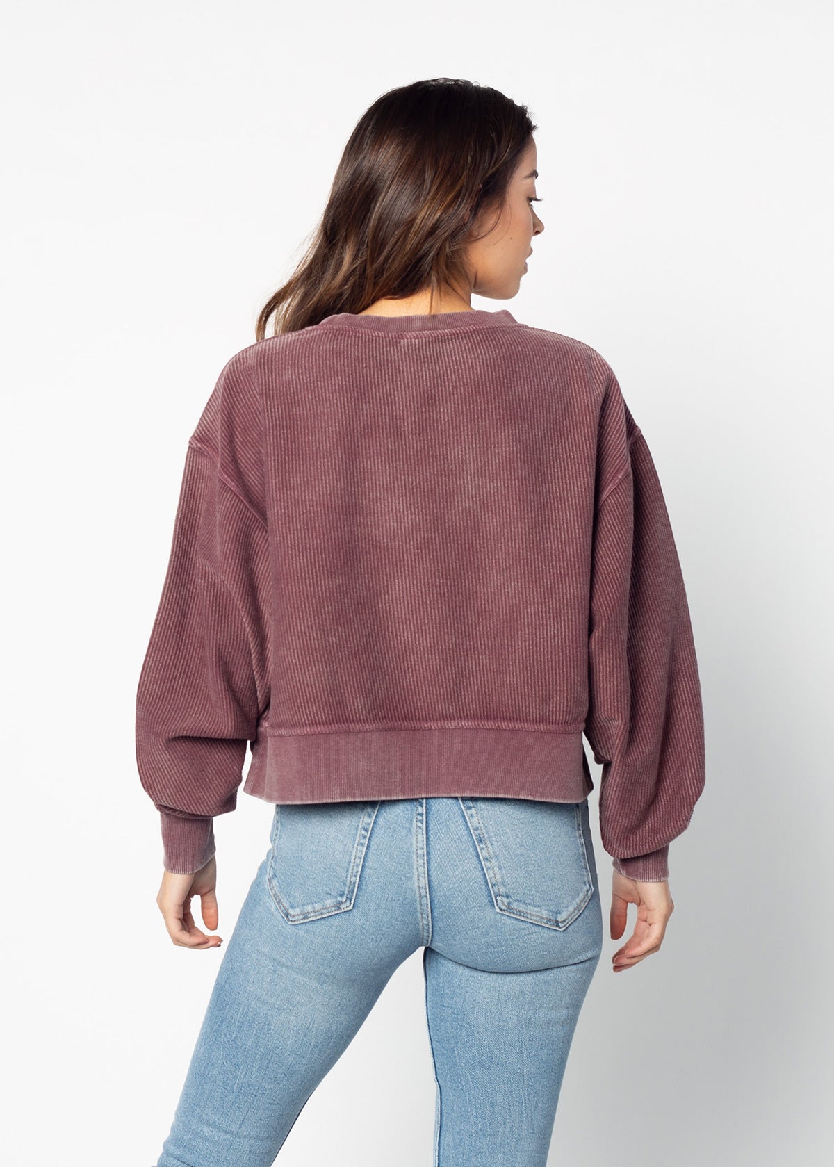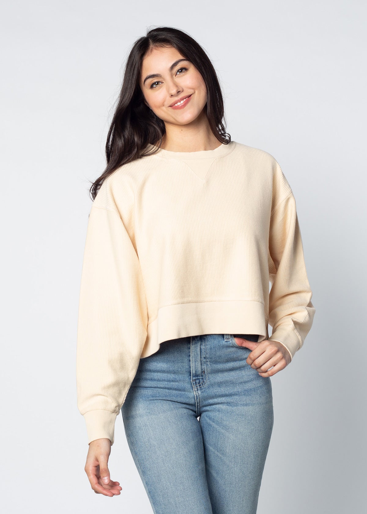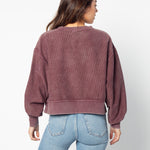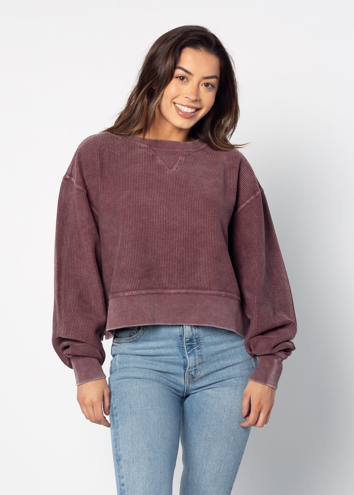 An update to our best seller! Oversized sweatshirt with a super soft vintage wash corded fabric. Waist-length, feminine silhouette features a ribbed neckline, cuff and hemline.