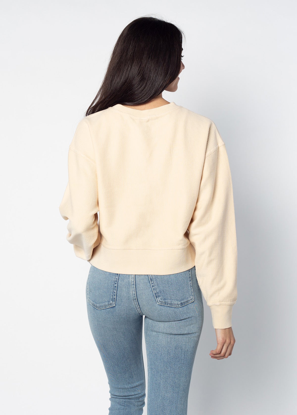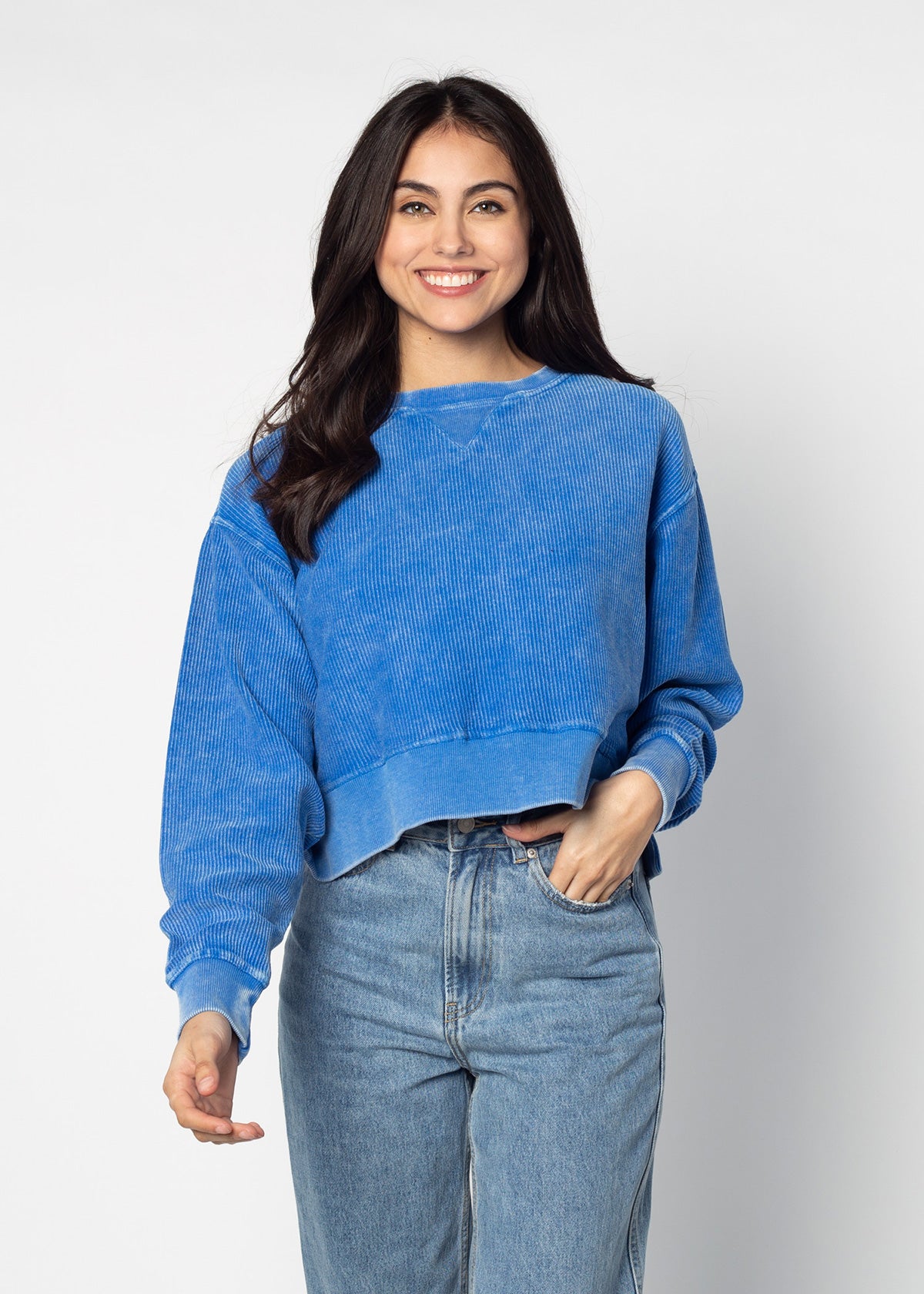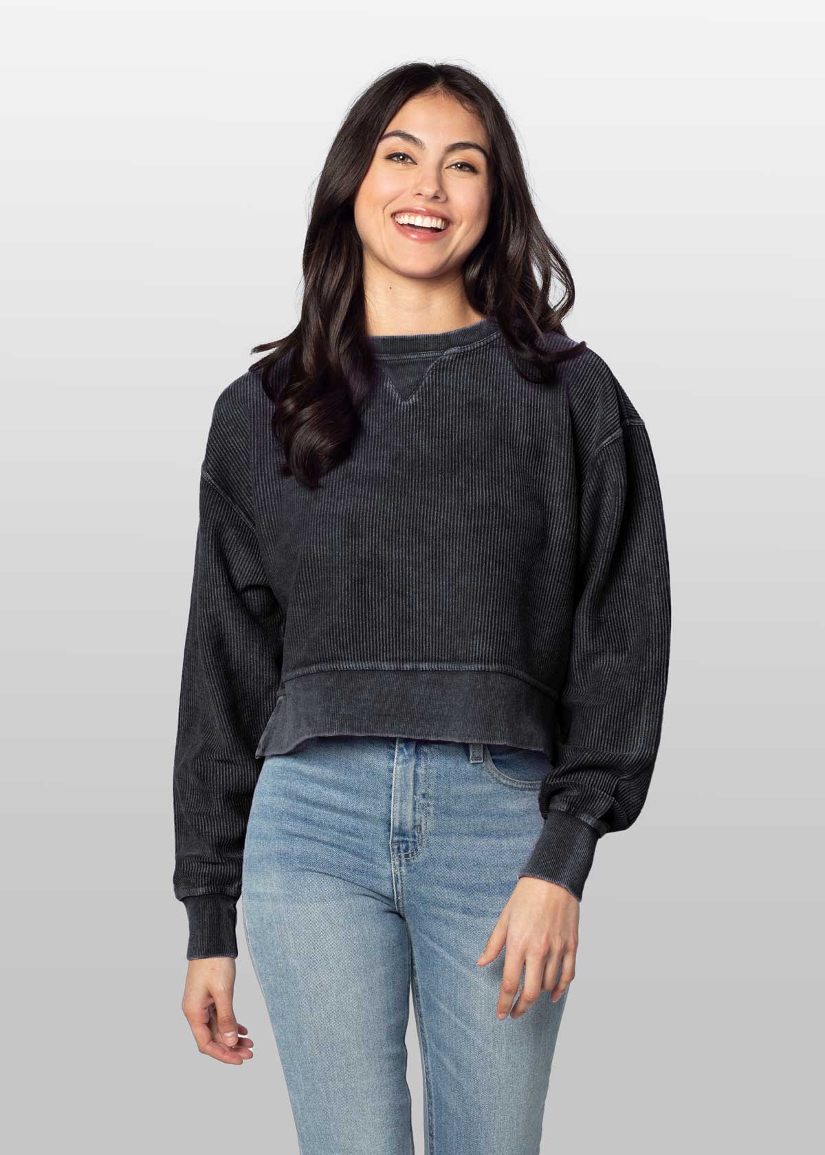 An update to our best seller! Oversized sweatshirt with a super soft vintage wash corded fabric. Waist-length, feminine silhouette features a ribbed neckline, cuff and hemline.