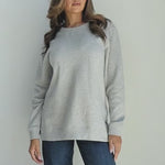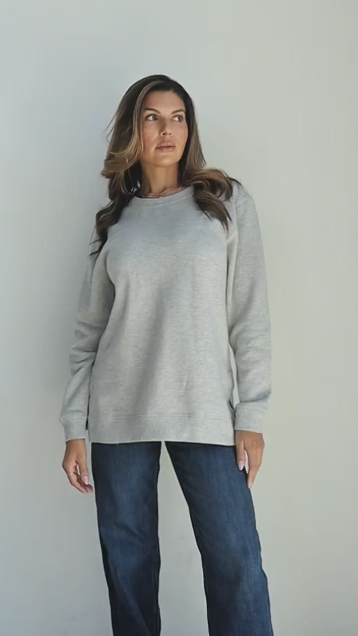 A classic crew neck fleece in a flattering tunic length that provides perfect coverage. Made for multitasking, the relaxed silhouette looks good in a variety of settings and pairs well with beloved jeans or leggings for extra comfort. Made from a heathered fleece with an extra smooth finish. Features easy-moving side slits finished with white twill tape