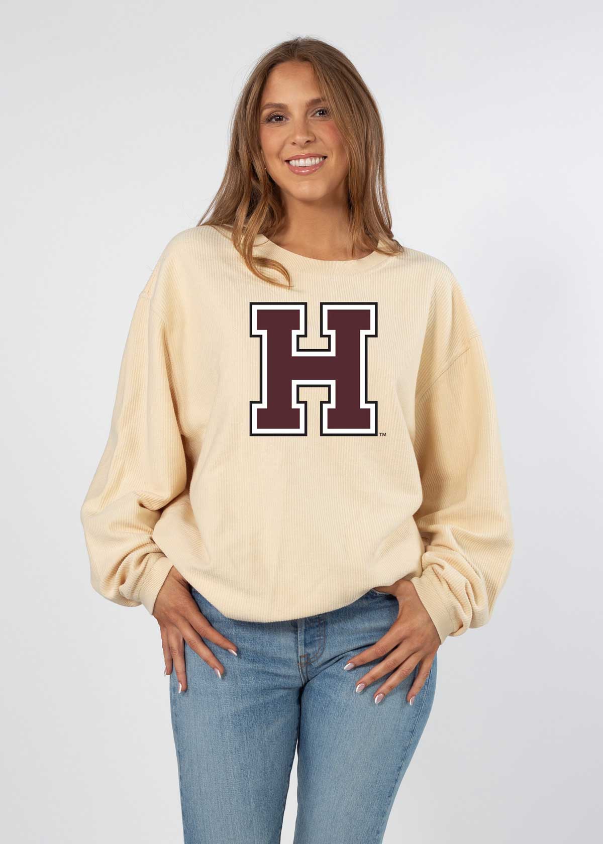 Meet the Harvard Big Logo Original Corded Crew. Our best seller! Oversized sweatshirt with a super soft, vintage wash corded fabric. Features a ribbed crew neckline, cuffs, and hemline.