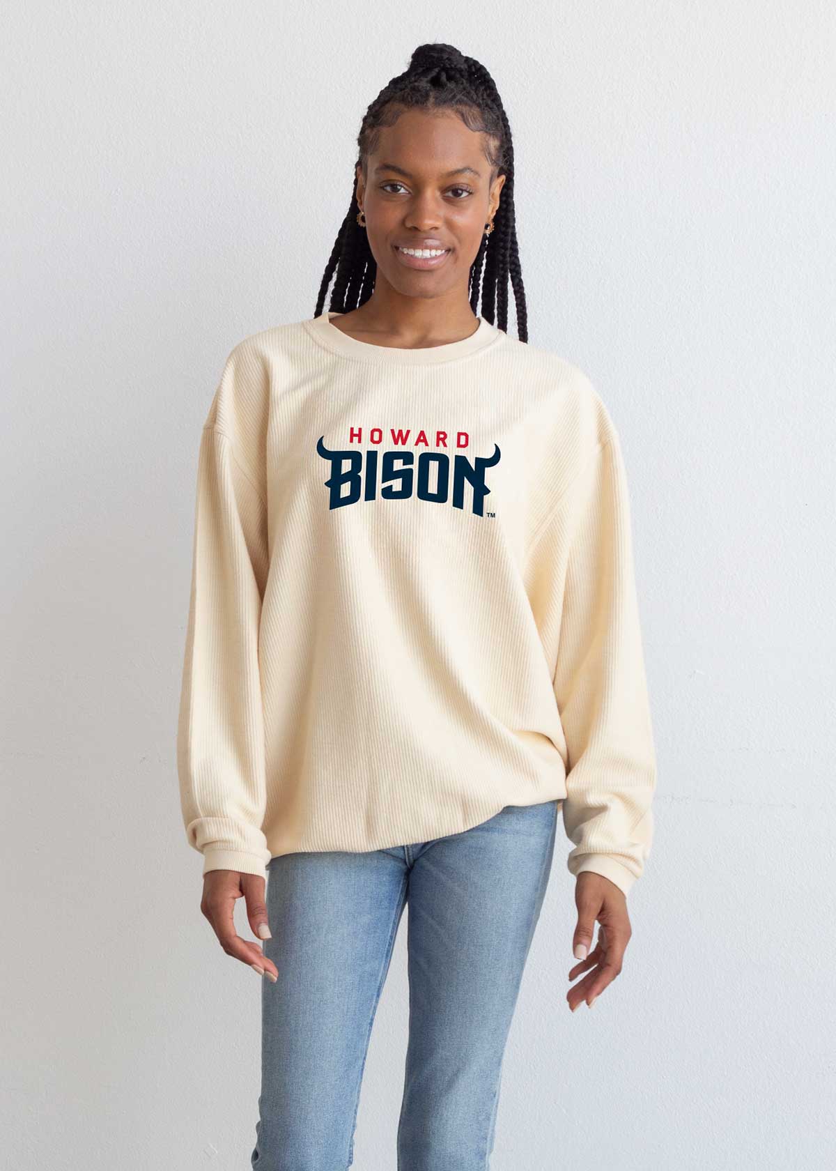 Meet the Howard Bison Big Logo Original Corded Crew. Our best seller! Oversized sweatshirt with a super soft, vintage wash corded fabric. Features a ribbed crew neckline, cuffs, and hemline.