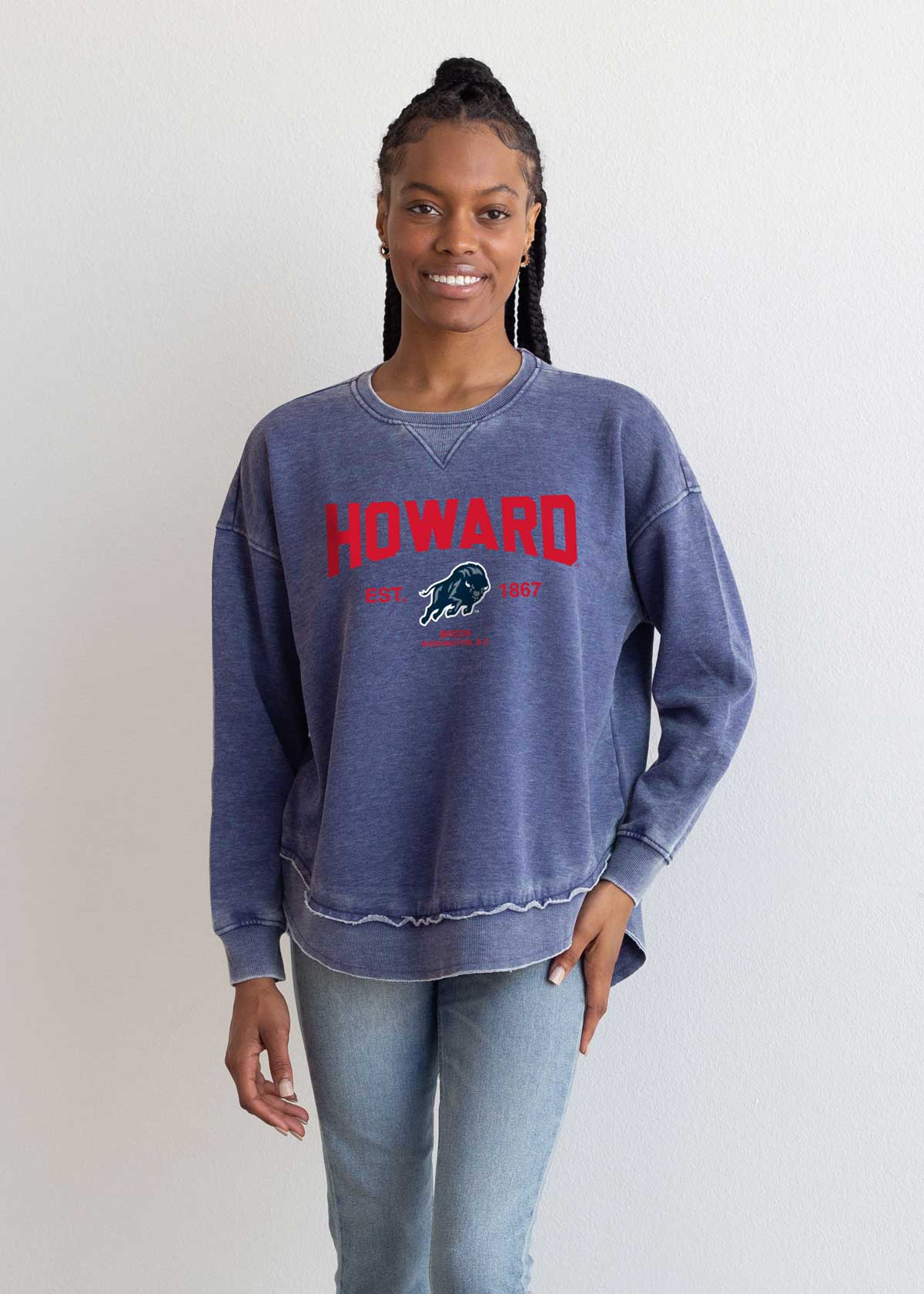 Meet the Howard Gameday Burnout Campus Pullover. This ultra-soft crew neck with dropped shoulders and relaxed hi-lo curved bottom hemline features a ribbed neckline, cuffs, and hem. Our favorite worn look is achieved by the burnout wash process.