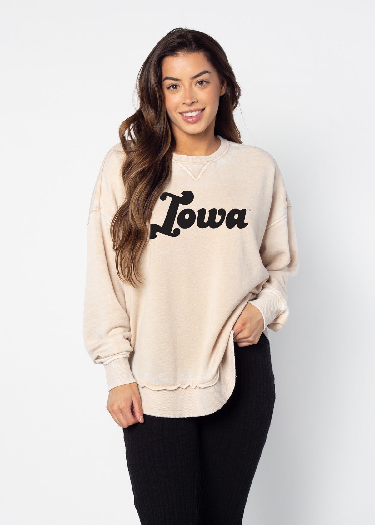 This ultra-soft Iowa Hawkeyes crew neck with dropped shoulders and relaxed hi-lo curved bottom hemline features ribbed neckline, cuffs and hem. Our favorite worn look is achieved by the burnout wash process.