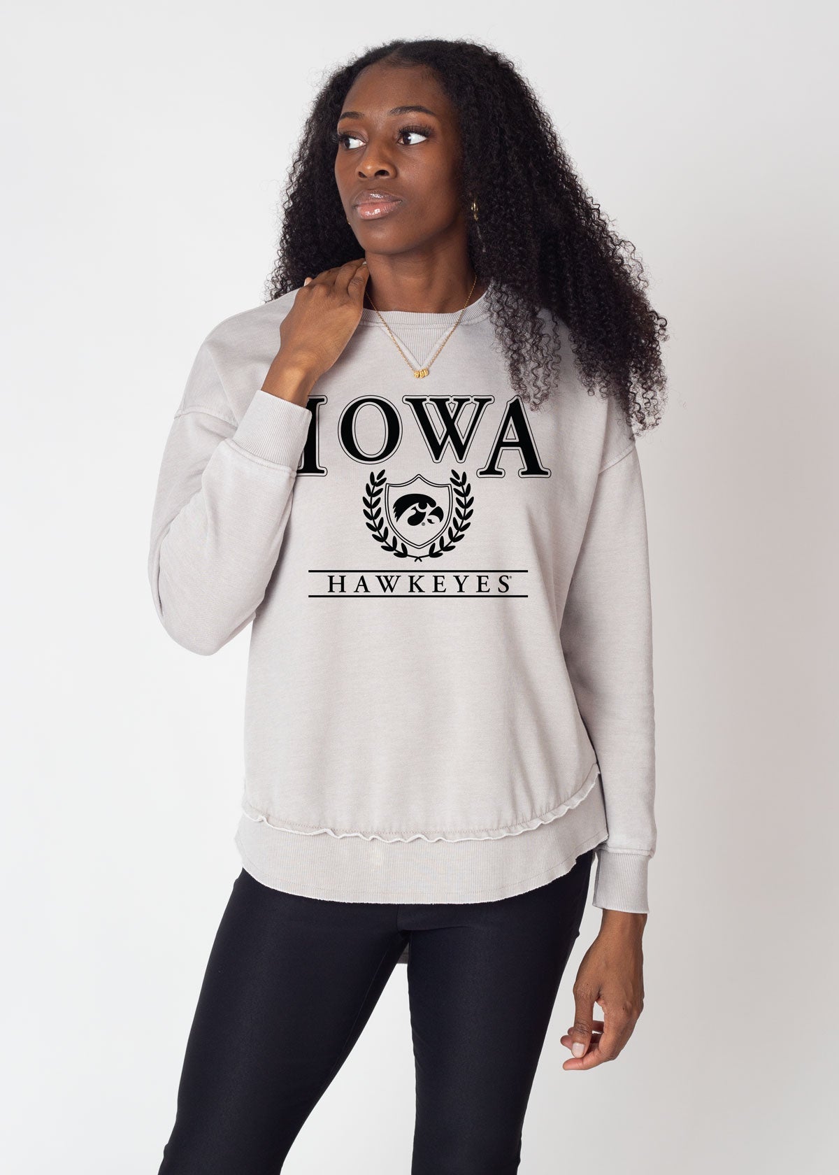 This ultra-soft Iowa Hawkeyes crew neck with dropped shoulders and relaxed hi-lo curved bottom hemline features ribbed neckline, cuffs and hem. Our favorite worn look is achieved by the burnout wash process.