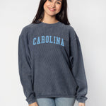 Our best seller! The oversized North Carolina Tar Heels Corded Crew sweatshirt features a super soft, vintage wash corded fabric. Ribbed crew neckline, cuffs, and hemline. Each piece is individually dyed, so please note there may be variation in color piece to piece. Sometimes, there can be a light streak at the shoulder due to the unique dye process, which is common.