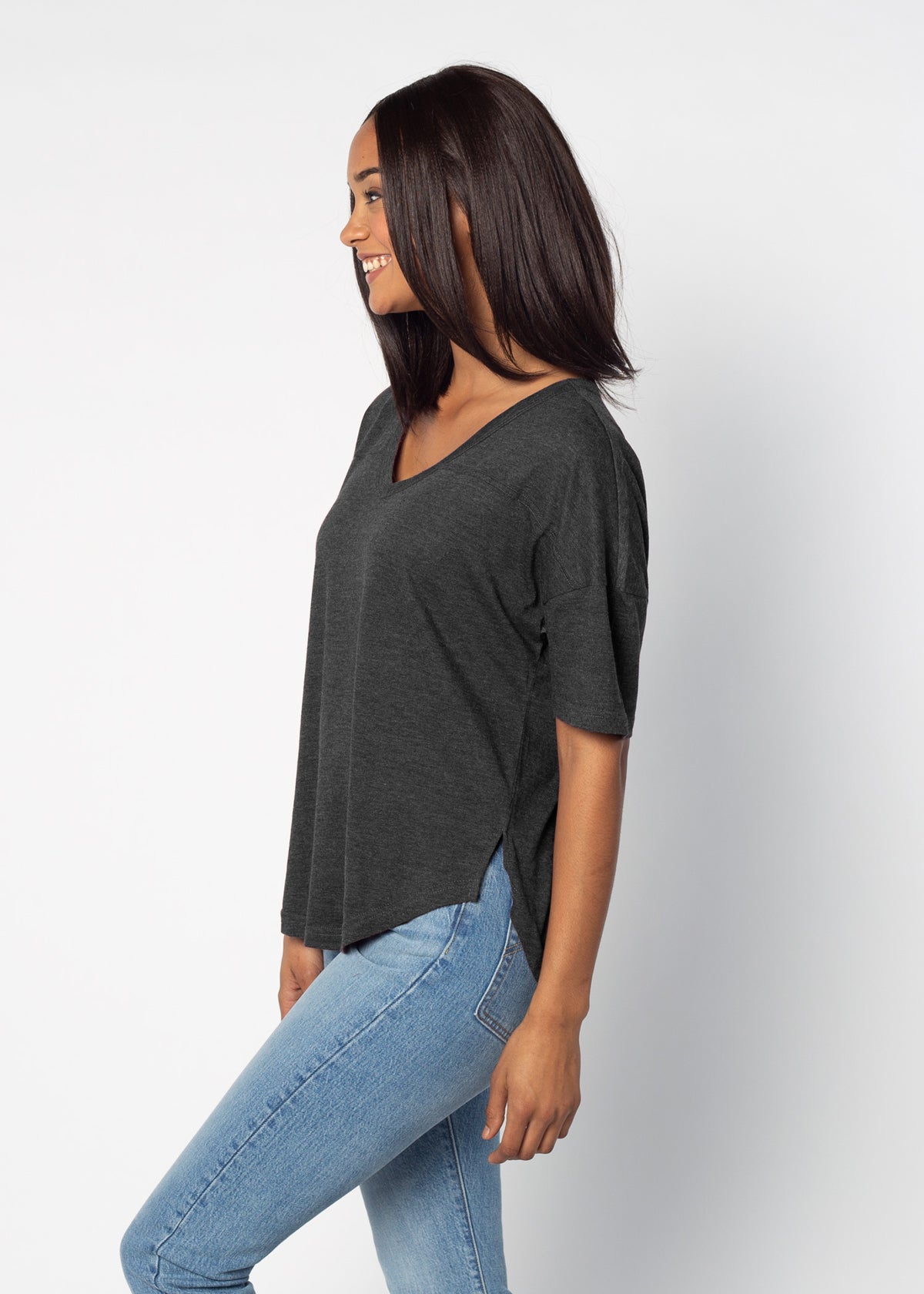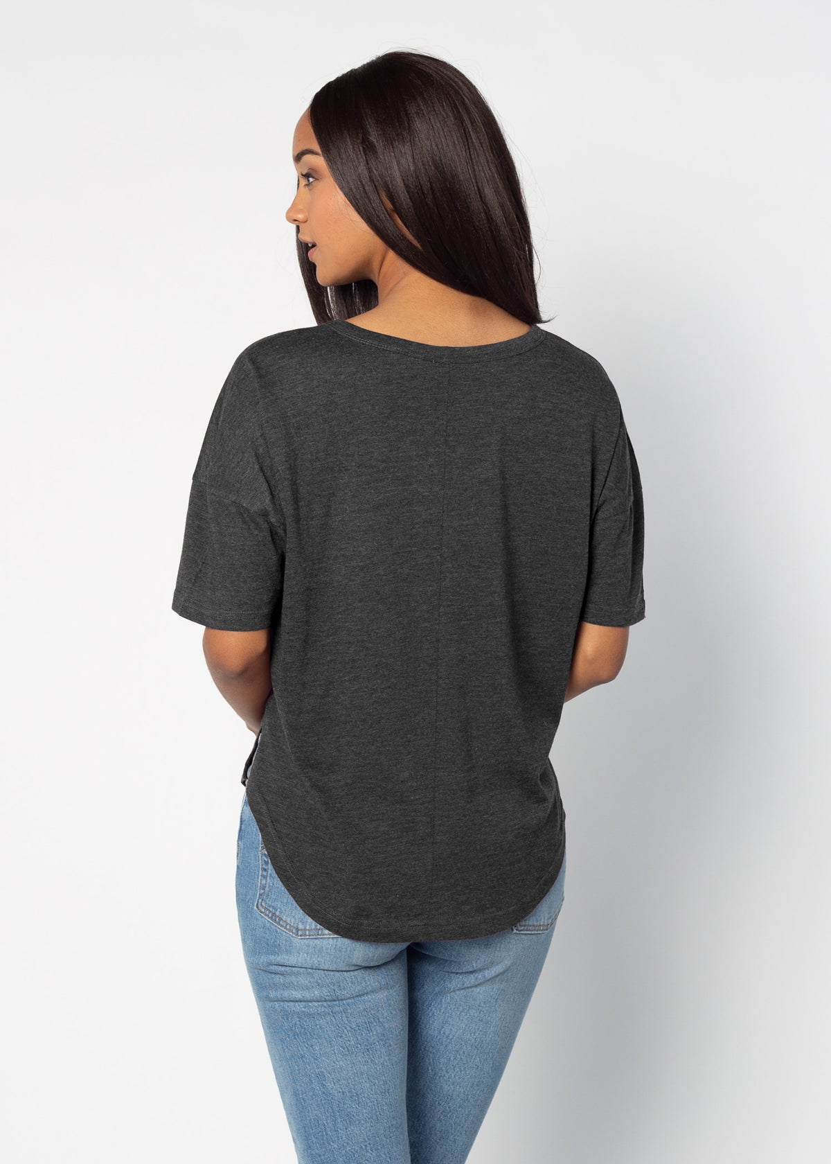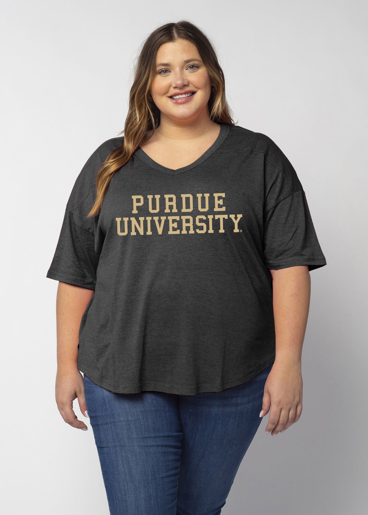 Elevate your Purdue Boilermakers essentials with this short sleeve dolman tee. Made from a breathable cotton poly blend with a subtle heathered look and a soft hand feel. The tee has a semi-rounded v-neckline, dropped shoulders, and a shirttail hem with side slits.