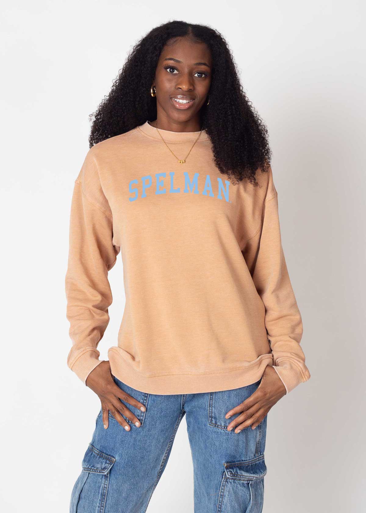 Meet the Spelman Brown Campus Crew Sweatshirt. The softest, coziest fleece you'll ever wear. Buttery soft to the touch and burnout wash treatment for an edgy take on this classic silhouette. Unisex oversized fleece sweatshirt with ribbed neckline, cuffs, hem. Dropped shoulders and relaxed bottom hemline.