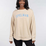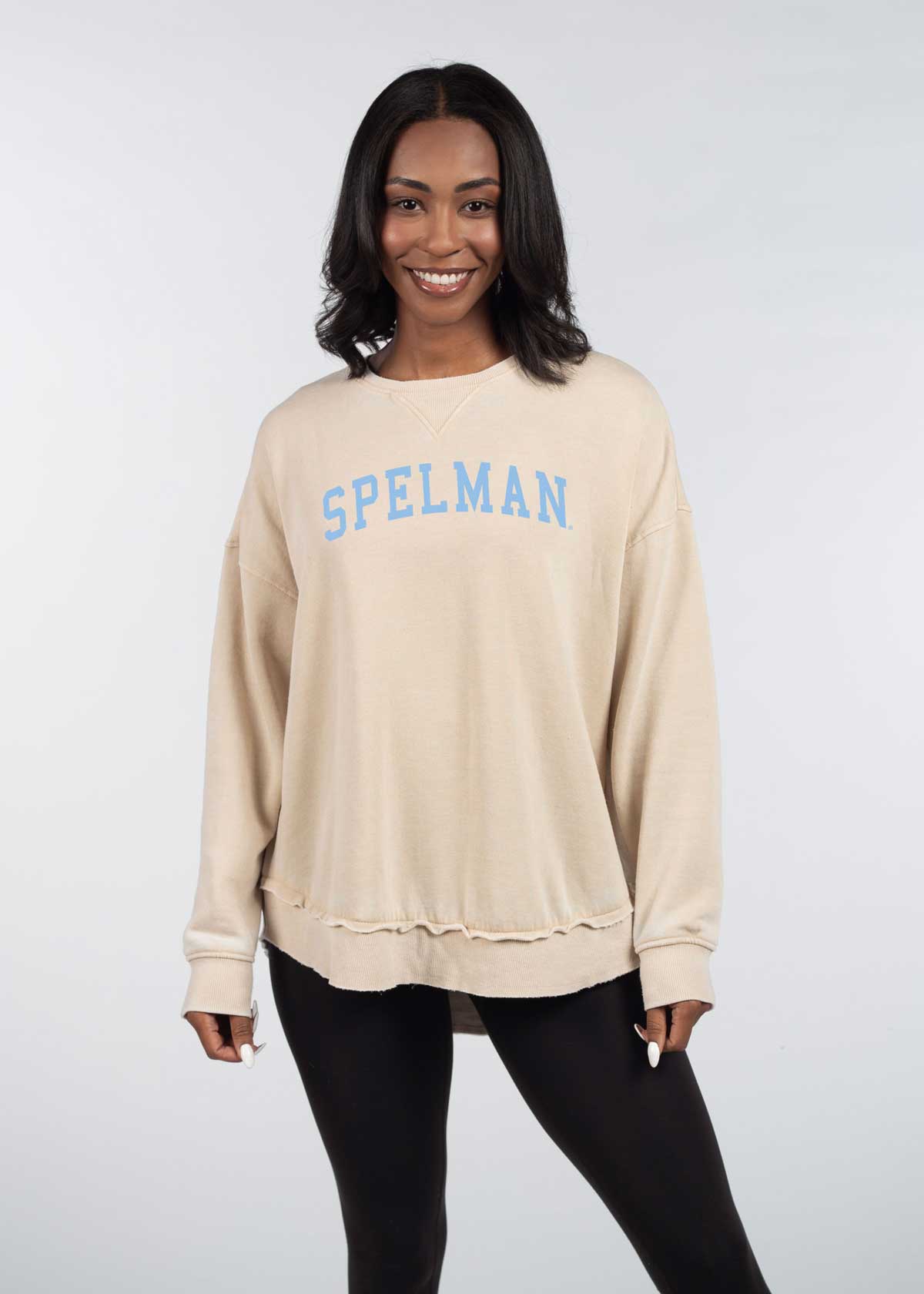 Meet the Spelman Classic College Burnout Pullover. This ultra-soft crew neck with dropped shoulders and relaxed hi-lo curved bottom hemline features a ribbed neckline, cuffs, and hem. Our favorite worn look is achieved by the burnout wash process.