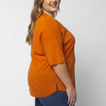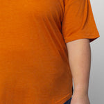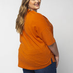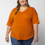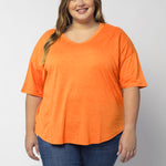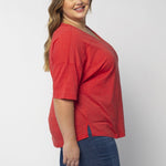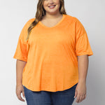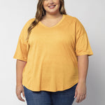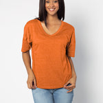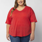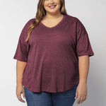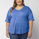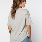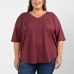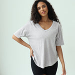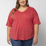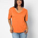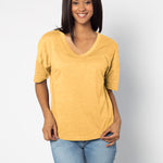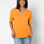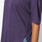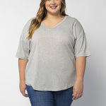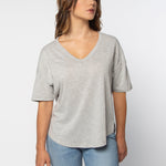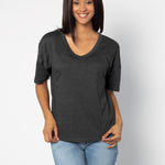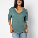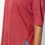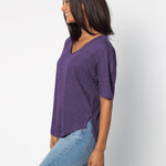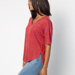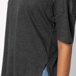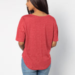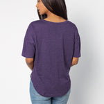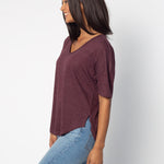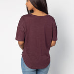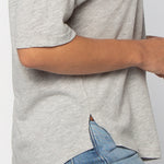 Elevate your basics with this short sleeve dolman tee. Made from a breathable cotton poly blend with a subtle heathered look and a soft hand feel. The tee has a semi-rounded v-neckline, dropped shoulders, and a shirttail hem with side slits.