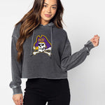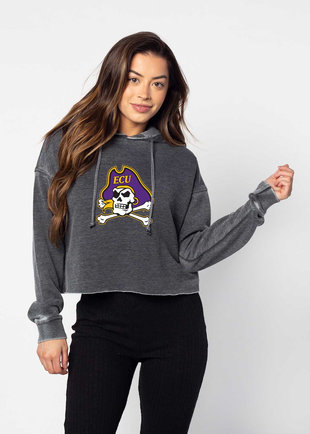 Meet the ECU Big Logo Mid-Length Hoodie. The softest hoodie you'll own! Roomy and boxy burnout fleece cropped hoodie. Features a drawstring hood, dropped shoulders, and raw edge hemline. Burnout wash process provides a unique, washed and worn look and a comfortable feel. Pairs perfectly with our burnout joggers for trendy matching set.