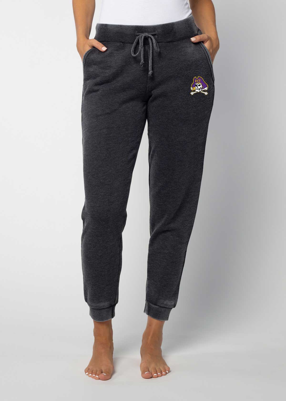 Meet the ECU Charcoal Campus Sweatpants. Buttery soft to the touch finished with a burnout wash treatment that gives it a lived-in look. Features ribbed waistband with a drawstring, side pockets and tapered legs with rib cuffs. Pairs perfectly with our 449, 480, 482 and 450 burnout fleece pullovers.