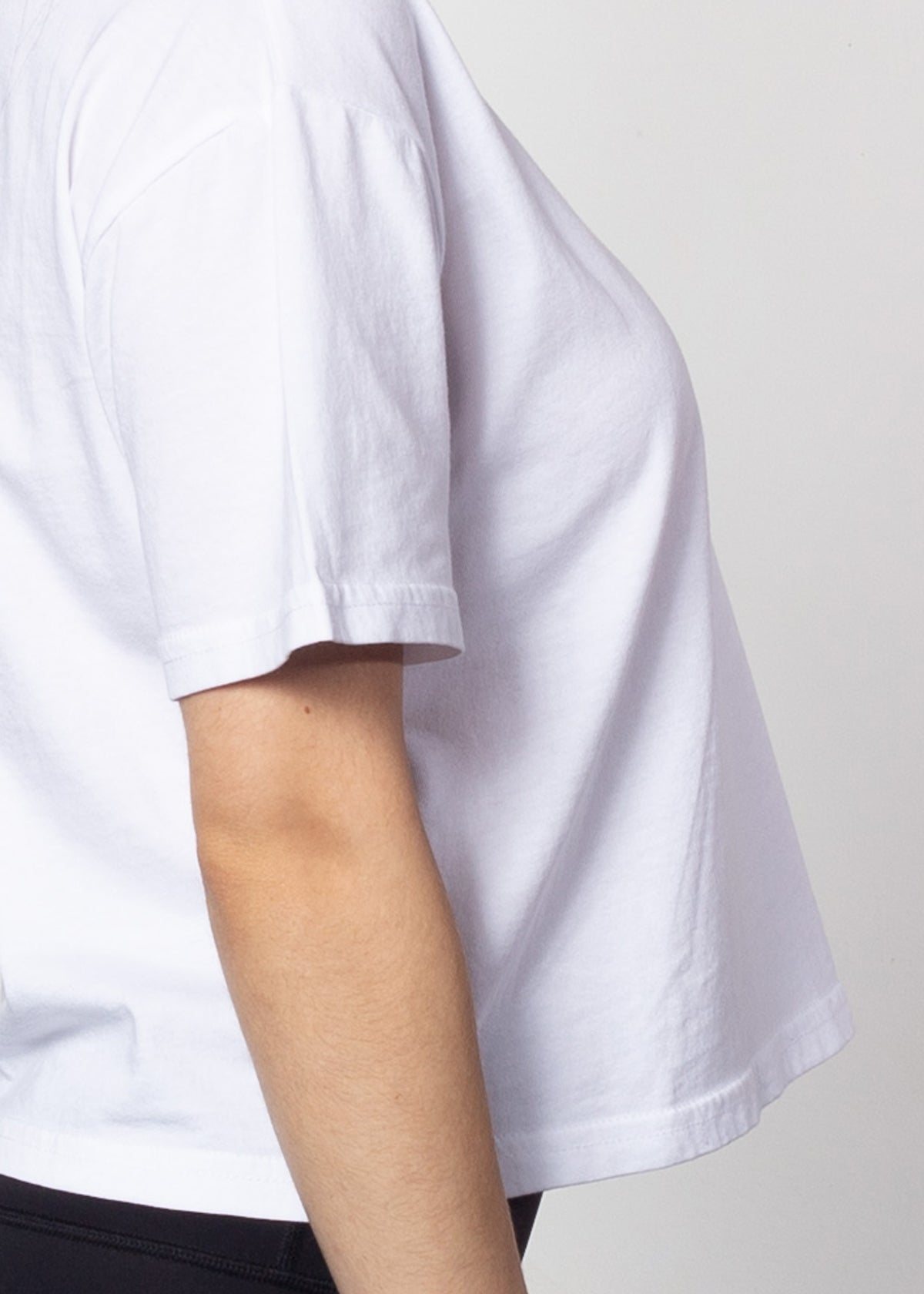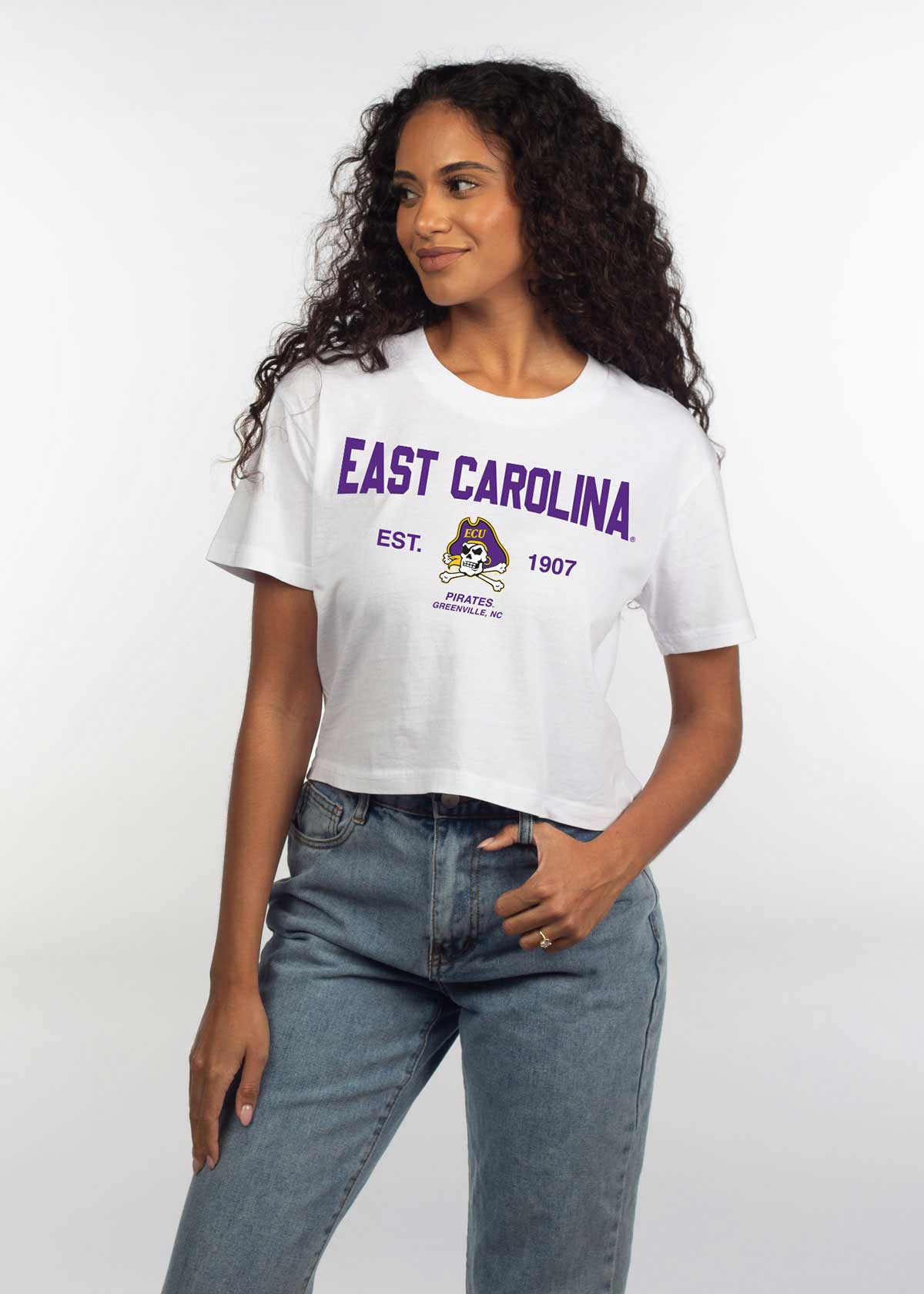 Meet the ECU Short 'N Sweet Tee in White. Your new go-to crop tee in a relaxed, boxy silhouette. The vintage inspired mineral wash adds another excuse to get this tee asap.