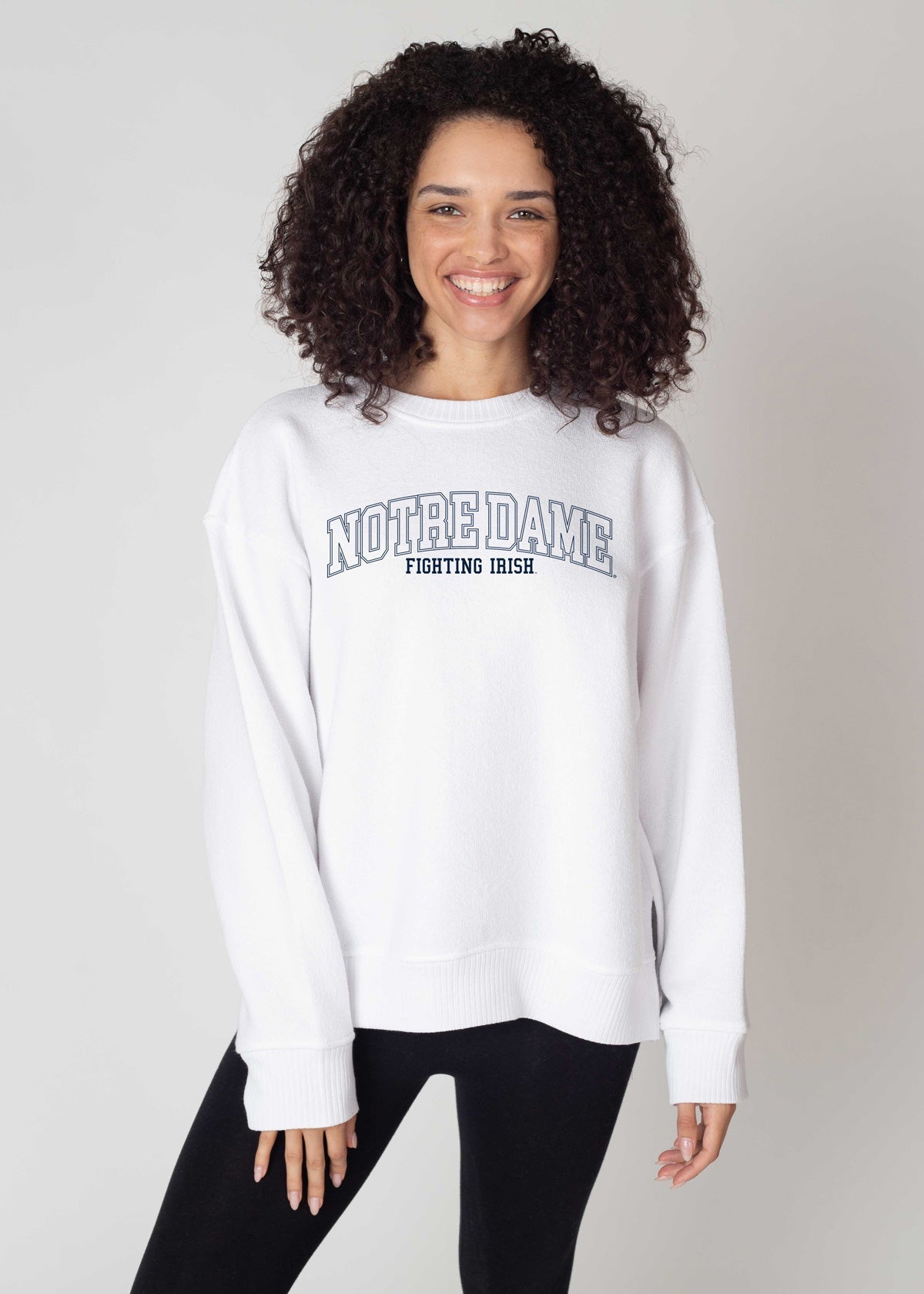 Meet the Notre Dame Half Time Tunic Sweatshirt. Meet our high-low tunic fleece, Made from white fleece with a textured sweater look on the outside and a brushed, buttery soft inside. This piece features a ribbed hemline, cuffs, and neckline, along with side slits and a high-low hem.