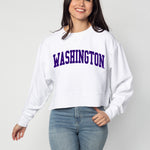 An update to our best seller! Washington Huskies oversized sweatshirt with a super soft vintage wash corded fabric. Waist-length, feminine silhouette features a ribbed neckline, cuff and hemline.