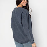 Our best seller! Officially licensed West Virginia Mountaineers oversized sweatshirt made with super soft, vintage-washed corded fabric. Features a ribbed crew neckline, cuffs, and hemline. Each piece is individually dyed, so please note there may be variation in color piece to piece. Sometimes, there can be a light streak at the shoulder due to the unique dye process, which is common.