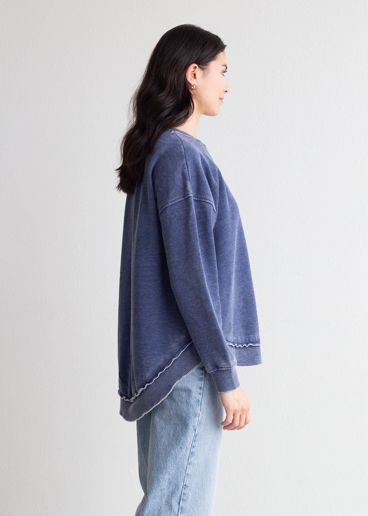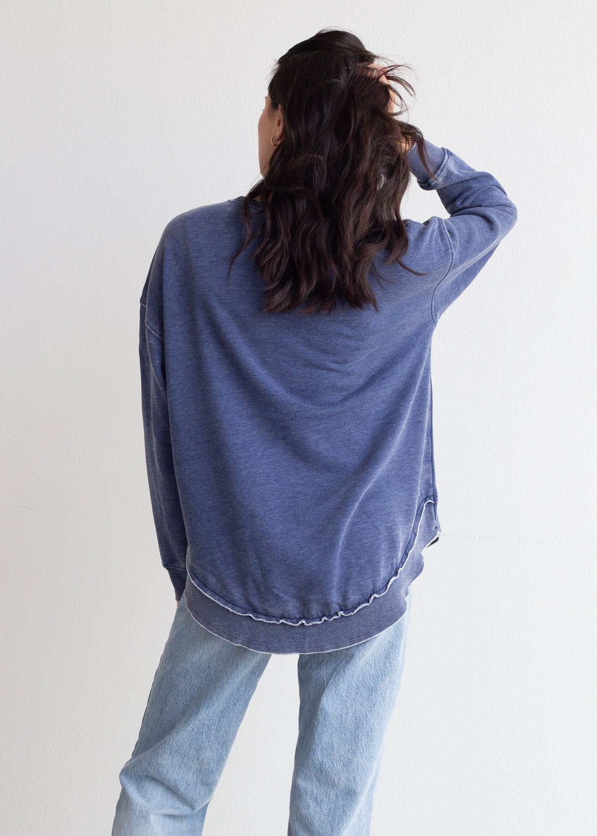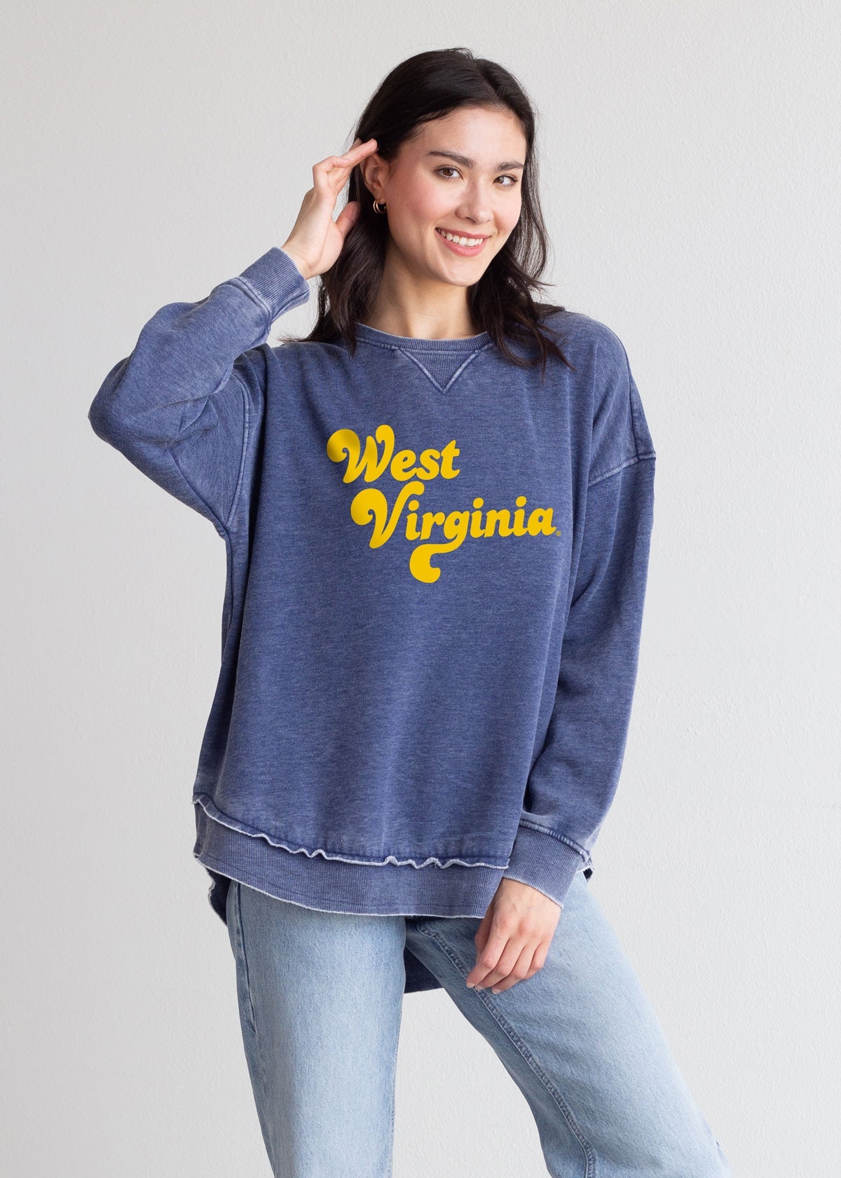 This ultra-soft West Virginia Mountaineers crew neck with dropped shoulders and relaxed hi-lo curved bottom hemline features ribbed neckline, cuffs and hem. Our favorite worn look is achieved by the burnout wash process.