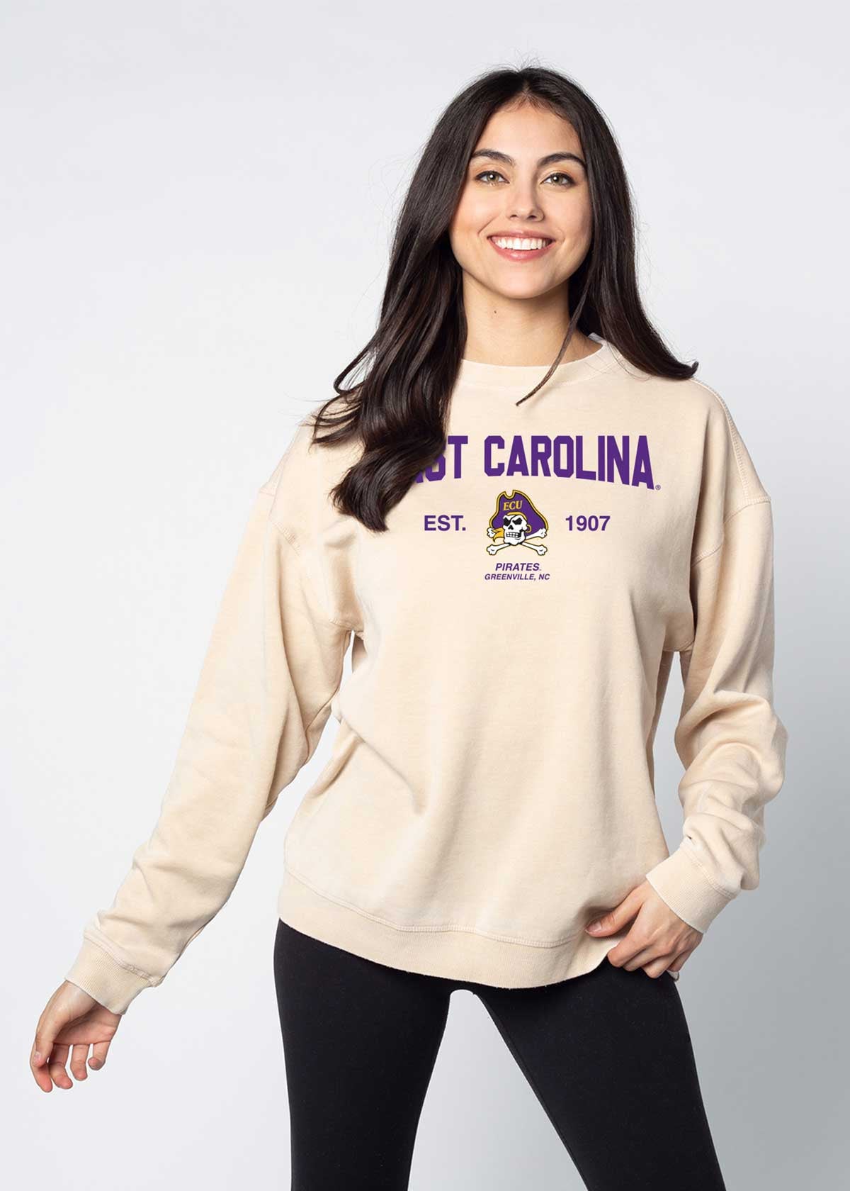 Meet the ECU Gameday Burnout Campus Pullover. The softest, coziest fleece you'll ever wear. Buttery soft to the touch and burnout wash treatment for an edgy take on this classic silhouette. Unisex oversized fleece sweatshirt with ribbed neckline, cuffs, hem. Dropped shoulders and relaxed bottom hemline.
