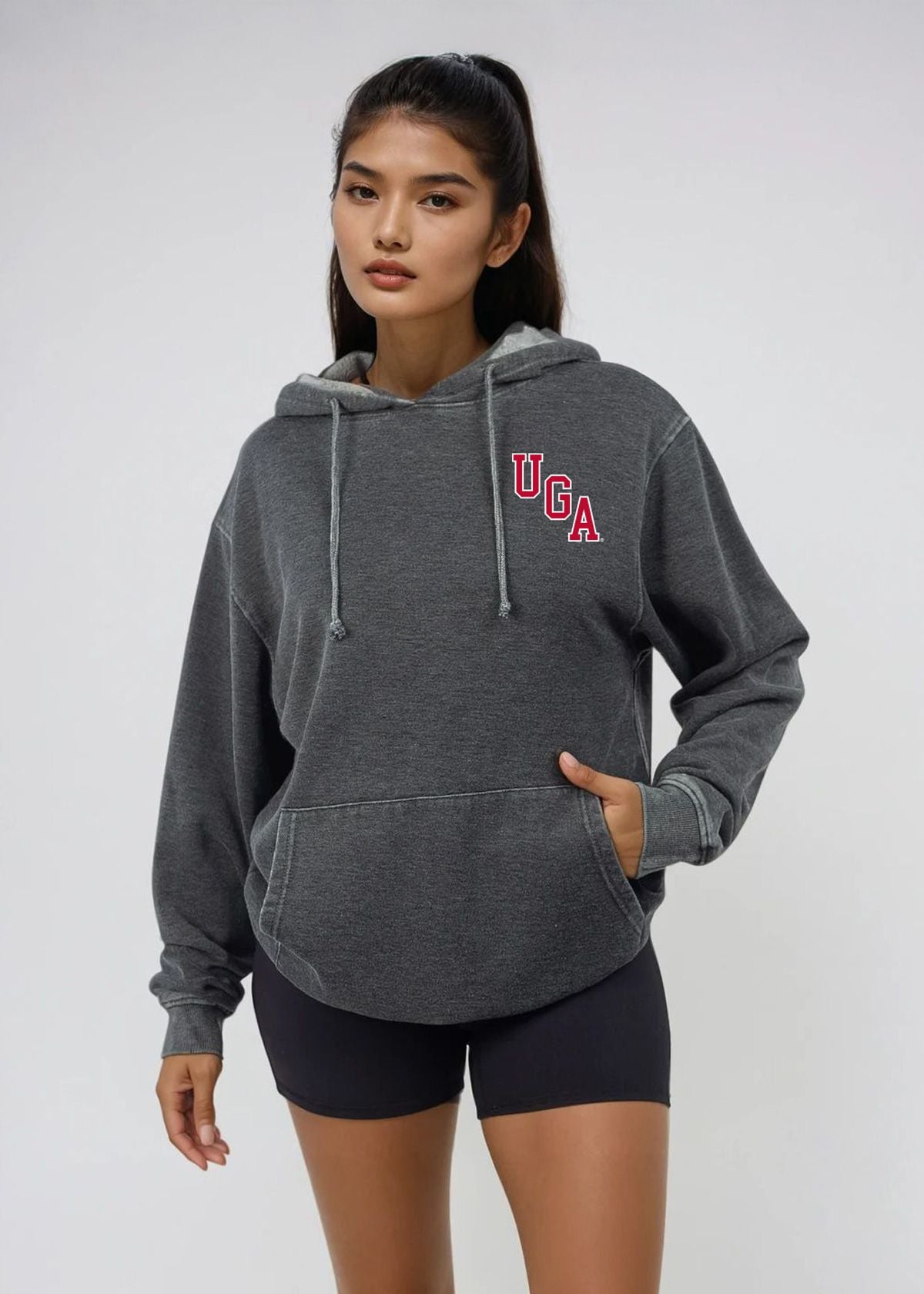 Unisex Georgia Bulldogs fleece hoodie with kangaroo front pocket now with a graphic on the front and back. Ribbed cuffs and hem. Dropped shoulders and relaxed bottom hemline. Burnout wash process provides a unique, washed and worn look and a comfortable feel.