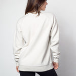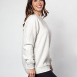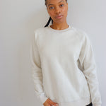 White womens crew sweatshirt with ribbed crew neck, raglan sleeves and hem.