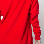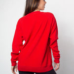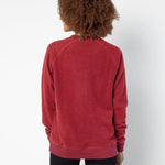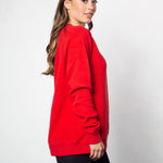 Red womens crew sweatshirt with ribbed crew neck, raglan sleeves and hem.