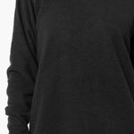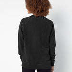 Black womens crew sweatshirt with ribbed crew neck, raglan sleeves and hem.