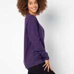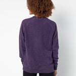 Purple womens crew sweatshirt with ribbed crew neck, raglan sleeves and hem.