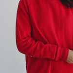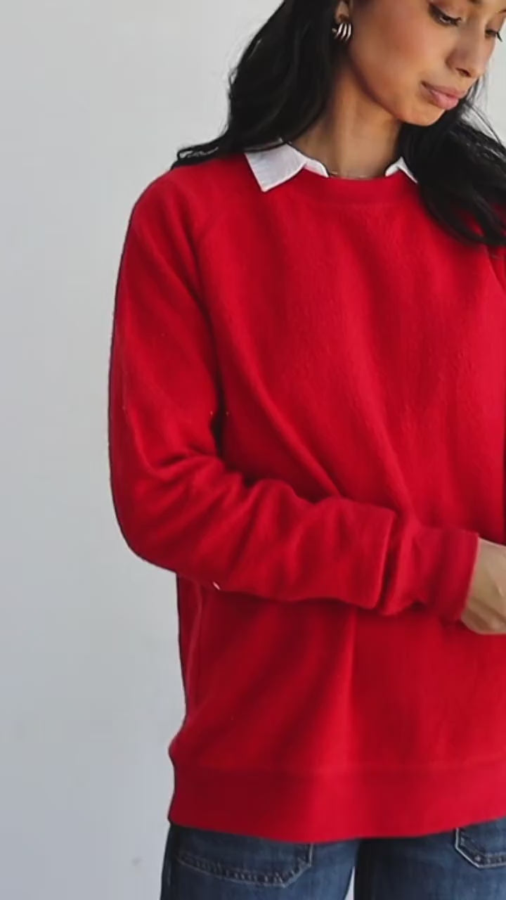 Red womens crew sweatshirt with ribbed crew neck, raglan sleeves and hem.