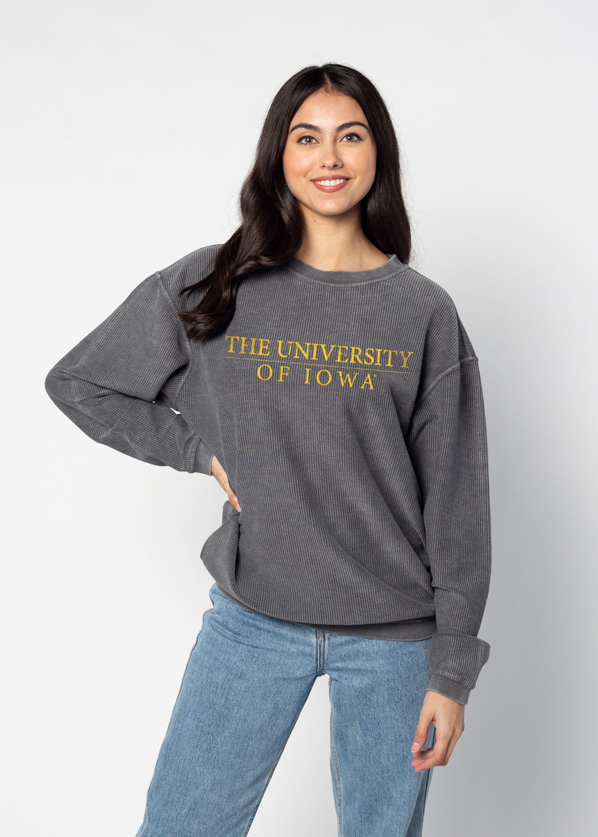 Our best seller! The oversized Iowa Hawkeyes Corded Crew sweatshirt features a super soft, vintage wash corded fabric. Ribbed crew neckline, cuffs, and hemline. Each piece is individually dyed, so please note there may be variation in color piece to piece. Sometimes, there can be a light streak at the shoulder due to the unique dye process, which is common.