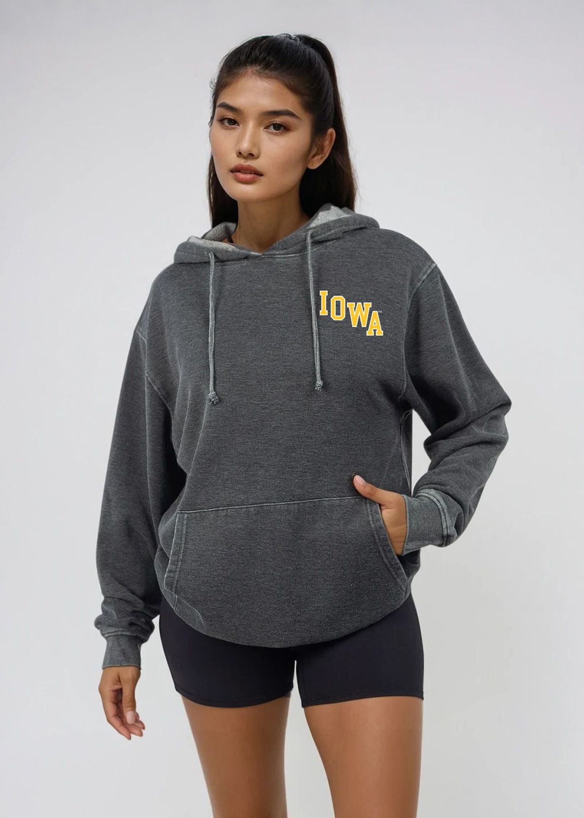 Unisex Iowa Hawkeyes fleece hoodie with kangaroo front pocket now with a graphic on the front and back. Ribbed cuffs and hem. Dropped shoulders and relaxed bottom hemline. Burnout wash process provides a unique, washed and worn look and a comfortable feel.