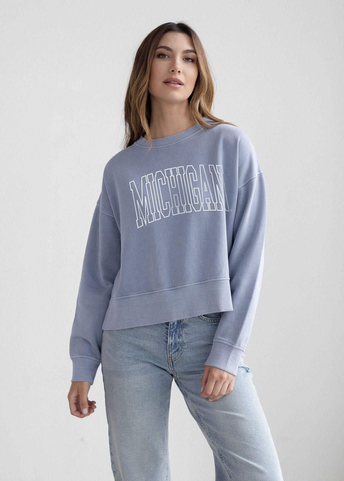 Introducing our Michigan Wolverines Malibu Crew sweatshirt, crafted from our signature Salt Wash fleece, this pullover is as soft as it gets, offering a luxurious feel against your skin. Designed to elevate your everyday style. Featuring a cropped length and flattering seaming details, along with a classic crew neckline and wide bottom rib band.