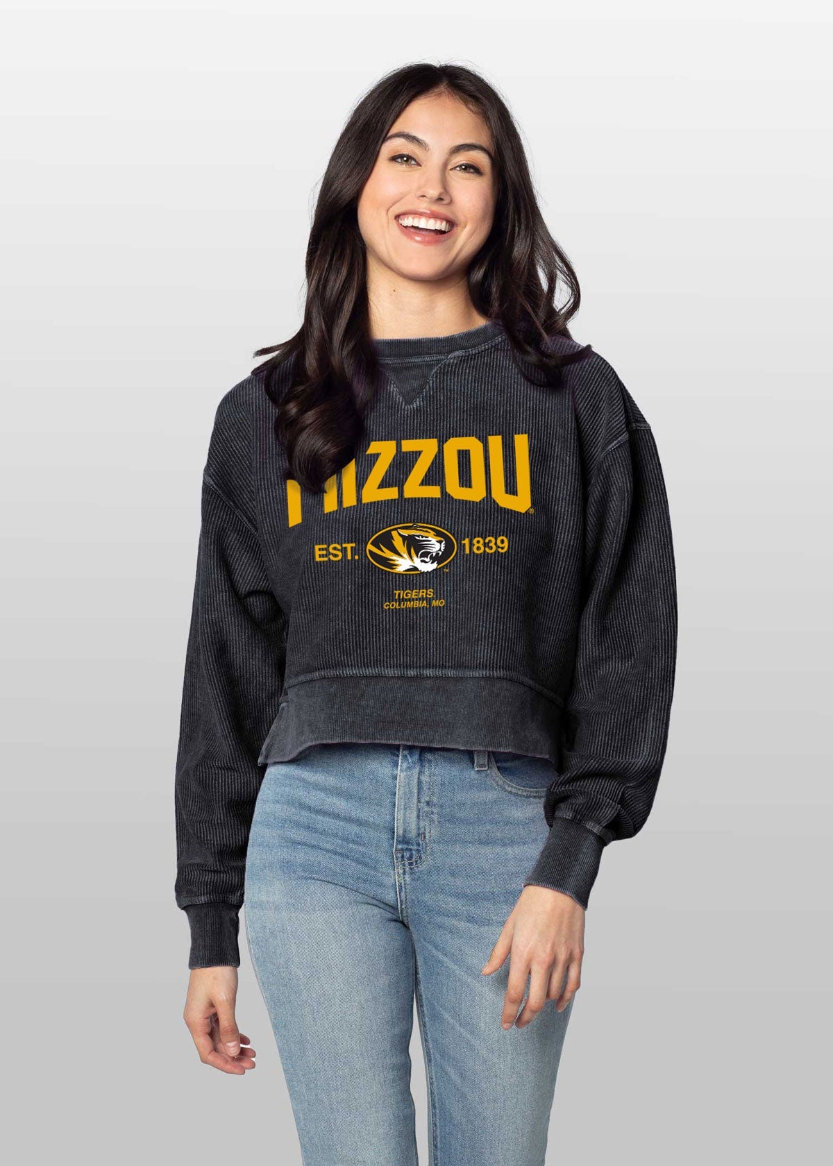 An update to our best seller! Missouri Tigers oversized sweatshirt with a super soft vintage wash corded fabric. Shorter cropped, feminine silhouette features a ribbed neckline, cuff and hemline.