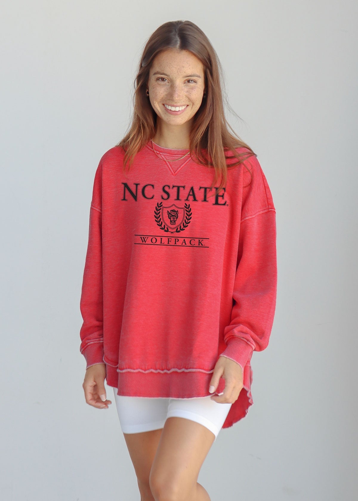 This ultra-soft NC State Wolfpack crew neck with dropped shoulders and relaxed hi-lo curved bottom hemline features ribbed neckline, cuffs and hem. Our favorite worn look is achieved by the burnout wash process.