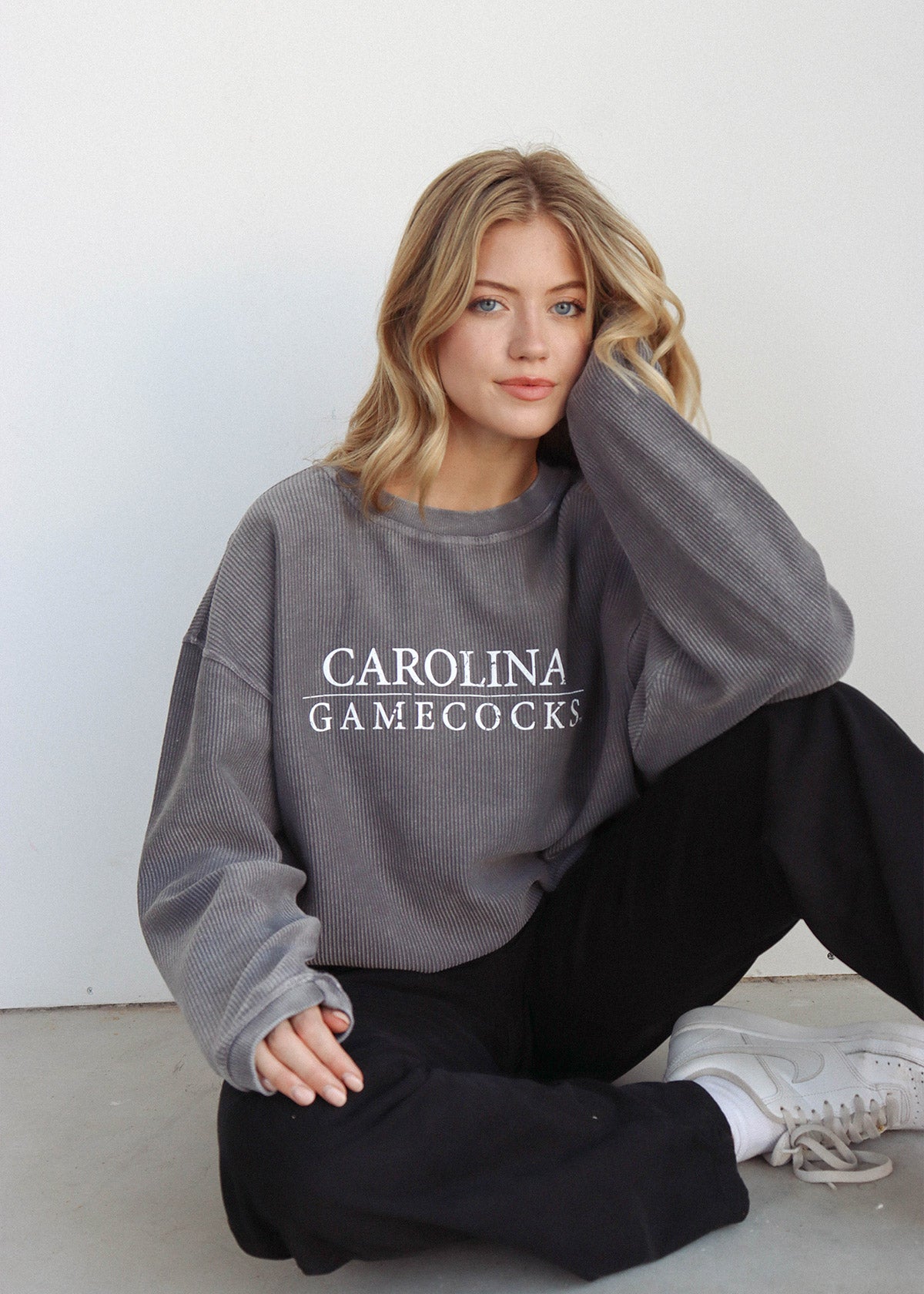 Our best seller! The oversized South Carolina Gamecocks Corded Crew sweatshirt features a super soft, vintage wash corded fabric. Ribbed crew neckline, cuffs, and hemline. Each piece is individually dyed, so please note there may be variation in color piece to piece. Sometimes, there can be a light streak at the shoulder due to the unique dye process, which is common.