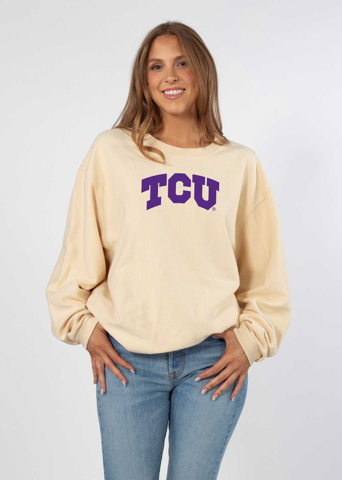 Meet the TCU Big Logo Original Corded Crew. Our best seller! Oversized sweatshirt with a super soft, vintage wash corded fabric. Features a ribbed crew neckline, cuffs, and hemline.
