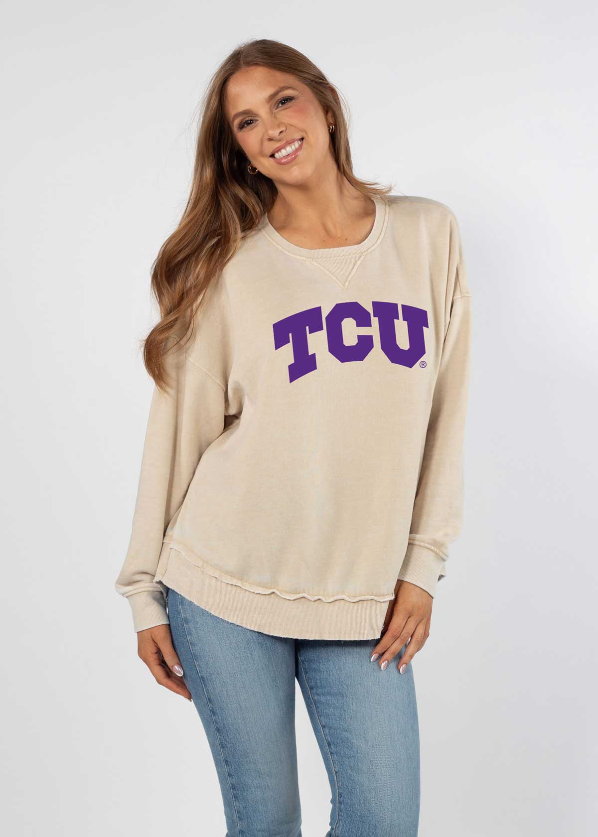 Meet the TCU Classic College Burnout Pullover. This ultra-soft crew neck with dropped shoulders and relaxed hi-lo curved bottom hemline features a ribbed neckline, cuffs, and hem. Our favorite worn look is achieved by the burnout wash process.